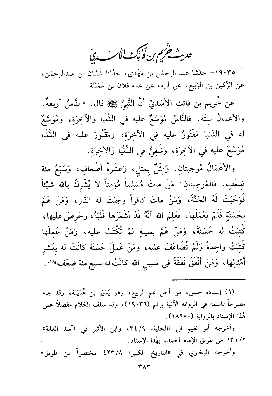 ١٩٠٣٥ - حَدَّثَنَا عَبْدُ الرَّحْمَنِ بْنُ مَهْدِيٍّ، حَدَّثَنَا شَيْبَانُ بْنُ عَبْدِ الرَّحْمَنِ، عَنِ الرُّكَيْنِ بْنِ الرَّبِيعِ، عَنْ أَبِيهِ، عَنْ عَمِّهِ فُلَانِ بْنِ عَمِيلَةَ، عَنْ خُرَيْمِ بْنِ فَاتِكٍ الْأَسَدِيِّ، أَنَّ النَّبِيَّ صَلَّى اللهُ عَلَيْهِ وَسَلَّمَ قَالَ: " النَّاسُ أَرْبَعَةٌ، وَالْأَعْمَالُ سِتَّةٌ، فَالنَّاسُ مُوَسَّعٌ عَلَيْهِ فِي الدُّنْيَا وَالْآخِرَةِ، وَمُوَسَّعٌ لَهُ فِي الدُّنْيَا مَقْتُورٌ عَلَيْهِ فِي الْآخِرَةِ، وَمَقْتُورٌ عَلَيْهِ فِي الدُّنْيَا مُوَسَّعٌ عَلَيْهِ فِي الْآخِرَةِ، وَشَقِيٌّ فِي الدُّنْيَا وَالْآخِرَةِ. وَالْأَعْمَالُ مُوجِبَتَانِ، وَمِثْلٌ بِمِثْلٍ، وَعَشْرَةُ أَضْعَافٍ، وَسَبْعُ مِائَةِ ضِعْفٍ. فَالْمُوجِبَتَانِ: مَنْ مَاتَ مُسْلِمًا مُؤْمِنًا لَا يُشْرِكُ بِاللهِ شَيْئًا فَوَجَبَتْ لَهُ الْجَنَّةُ، وَمَنْ مَاتَ كَافِرًا وَجَبَتْ لَهُ النَّارُ، وَمَنْ هَمَّ بِحَسَنَةٍ فَلَمْ يَعْمَلْهَا، فَعَلِمَ اللهُ أَنَّهُ قَدْ أَشْعَرَهَا قَلْبَهُ، وَحَرَصَ عَلَيْهَا، كُتِبَتْ لَهُ حَسَنَةً، وَمَنْ هَمَّ بِسَيِّئَةٍ لَمْ تُكْتَبْ عَلَيْهِ، وَمَنْ عَمِلَهَا كُتِبَتْ وَاحِدَةً وَلَمْ تُضَاعَفْ عَلَيْهِ، وَمَنْ عَمِلَ حَسَنَةً كَانَتْ لَهُ بِعَشْرِ أَمْثَالِهَا، وَمَنْ أَنْفَقَ نَفَقَةً فِي سَبِيلِ اللهِ كَانَتْ لَهُ بِسَبْعِ مِائَةِ ضِعْفٍ " (١)
