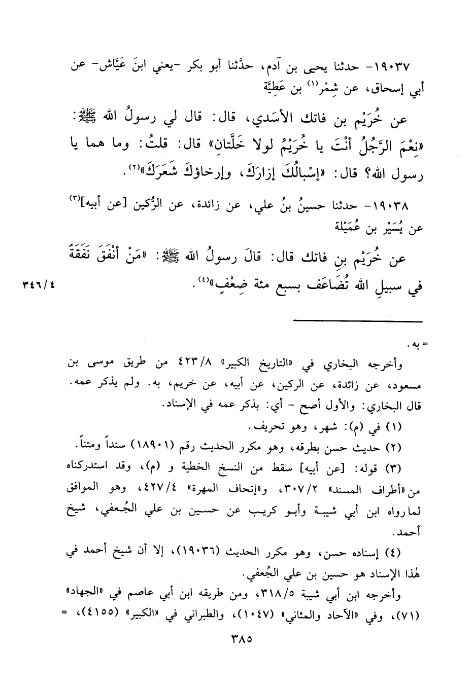 ١٩٠٣٧ - حَدَّثَنَا يَحْيَى بْنُ آدَمَ، حَدَّثَنَا أَبُو بَكْرٍ يَعْنِي ابْنَ عَيَّاشٍ، عَنْ أَبِي إِسْحَاقَ، عَنْ شَمْرِ (١) بْنِ عَطِيَّةَ، عَنْ خُرَيْمِ بْنِ فَاتِكٍ الْأَسَدِيِّ قَالَ: قَالَ لِي رَسُولُ اللهِ صَلَّى اللهُ عَلَيْهِ وَسَلَّمَ: " نِعْمَ الرَّجُلُ أَنْتَ يَا خُرَيْمُ، لَوْلَا خَلَّتَانِ " قَالَ: قُلْتُ: وَمَا هُمَا يَا رَسُولَ اللهِ؟ قَالَ: " إِسْبَالُكَ إِزَارَكَ، وَإِرْخَاؤُكَ شَعْرَكَ " (٢)