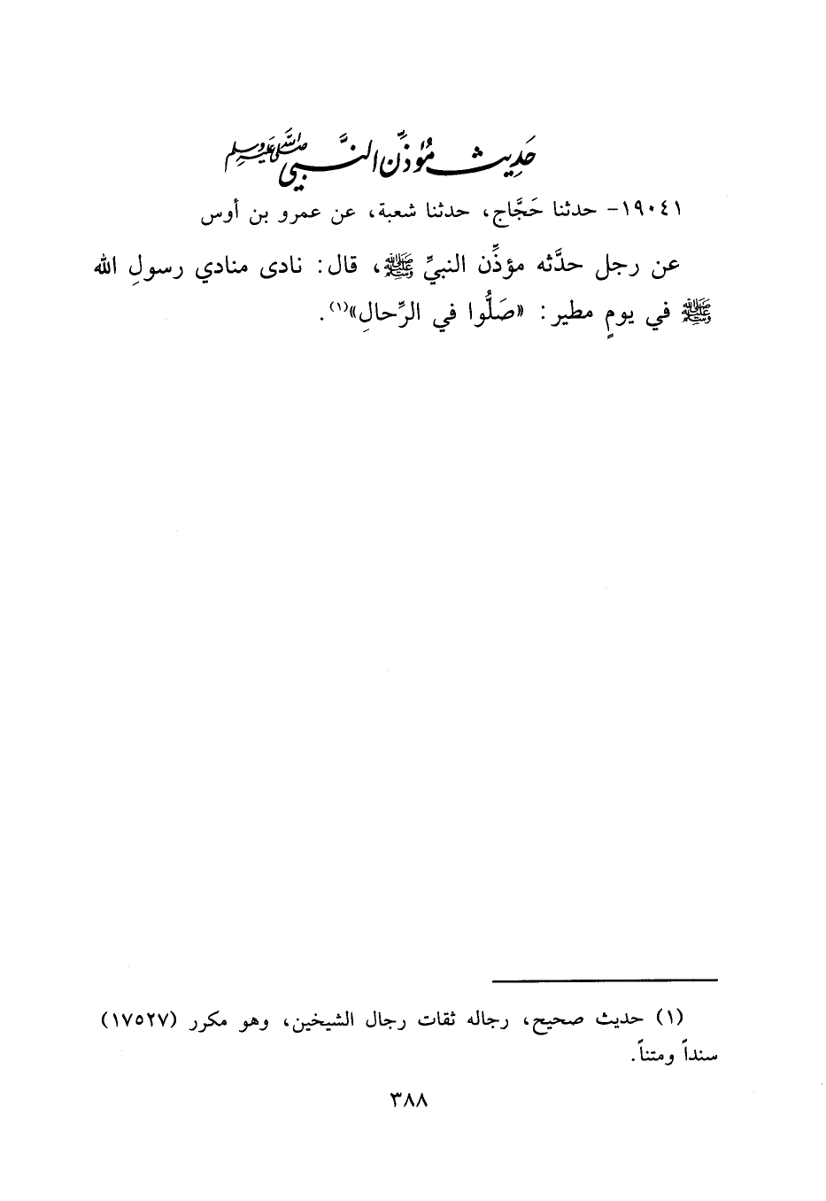 ١٩٠٤١ - حَدَّثَنَا حَجَّاجٌ، حَدَّثَنَا شُعْبَةُ، عَنْ عَمْرِو بْنِ دِينَارٍ، عَنْ عَمْرِو بْنِ أَوْسٍ، عَنْ رَجُلٍ، حَدَّثَهُ مُؤَذِّنُ النَّبِيِّ صَلَّى اللهُ عَلَيْهِ وَسَلَّمَ قَالَ: نَادَى مُنَادِي رَسُولِ اللهِ صَلَّى اللهُ عَلَيْهِ وَسَلَّمَ فِي يَوْمٍ مَطِيرٍ: " صَلُّوا فِي الرِّحَالِ " (١)