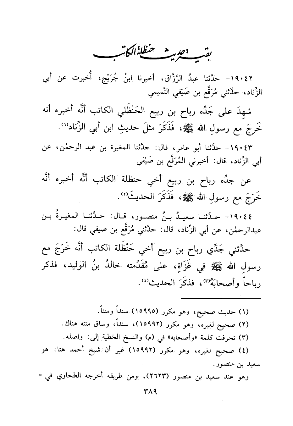 ١٩٠٤٤ - حَدَّثَنَا سَعِيدُ بْنُ مَنْصُورٍ قَالَ: حَدَّثَنَا الْمُغِيرَةُ بْنُ عَبْدِ الرَّحْمَنِ، عَنْ أَبِي الزِّنَادِ قَالَ: حَدَّثَنِي مُرَقِّعُ بْنُ صَيْفِيٍّ قَالَ: حَدَّثَنِي جَدِّي رَبَاحِ بْنُ رُبَيِّعٍ أَخِي حَنْظَلَةَ الْكَاتِبِ " أَنَّهُ خَرَجَ مَعَ رَسُولِ اللهِ صَلَّى اللهُ عَلَيْهِ وَسَلَّمَ فِي غَزَاةٍ عَلَى مُقَدِّمَتِهِ خَالِدُ بْنُ الْوَلِيدِ فَذَكَرَ رَبَاحًا وَأَصْحَابَهُ (٣) " فَذَكَرَ الْحَدِيثَ (٤)