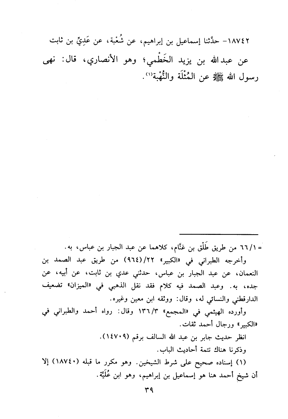 ١٨٧٤٢ - حَدَّثَنَا إِسْمَاعِيلُ بْنُ إِبْرَاهِيمَ، عَنْ شُعْبَةَ، عَنْ عَدِيِّ بْنِ ثَابِتٍ، عَنْ عَبْدِ اللهِ بْنِ يَزِيدَ الْخَطْمِيِّ وَهُوَ الْأَنْصَارِيُّ قَالَ: " نَهَى رَسُولُ اللهِ صَلَّى اللهُ عَلَيْهِ وَسَلَّمَ عَنِ الْمُثْلَةِ وَالنُّهْبَةِ " (١)
