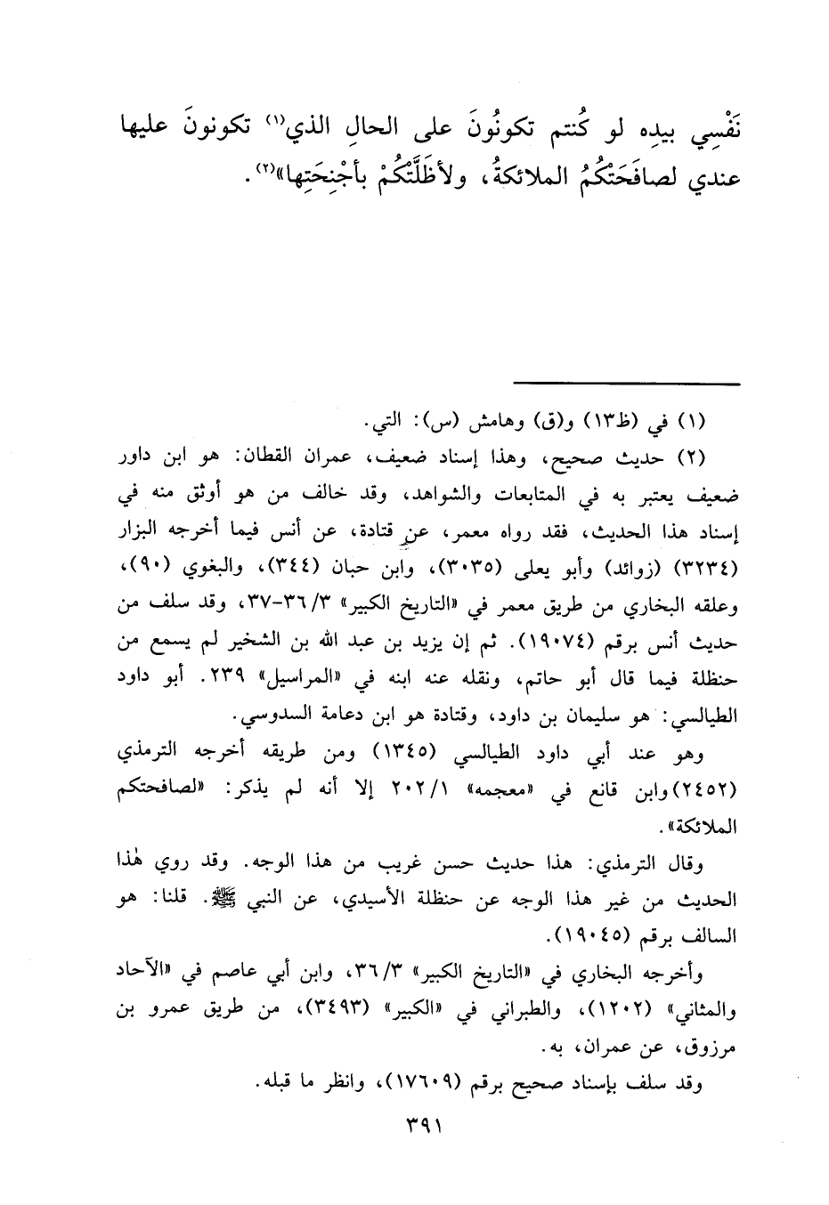نَفْسِي بِيَدِهِ لَوْ كُنْتُمْ تَكُونُونَ عَلَى الْحَالِ الَّذِي (١) تَكُونُونَ عَلَيْهَا عِنْدِي لَصَافَحَتْكُمُ الْمَلَائِكَةُ، وَلَأَظَلَّتْكُمْ بِأَجْنِحَتِهَا " (٢)