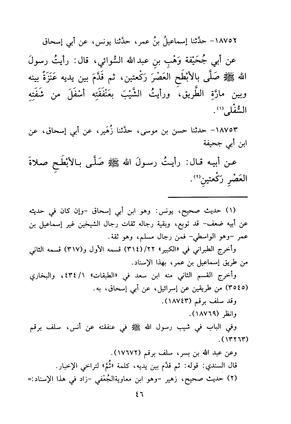 ١٨٧٥٣ - حَدَّثَنَا حَسَنُ بْنُ مُوسَى، حَدَّثَنَا زُهَيْرٌ، عَنْ أَبِي إِسْحَاقَ، عَنْ ابْنِ أَبِي جُحَيْفَةَ، عَنْ أَبِيهِ قَالَ: " رَأَيْتُ رَسُولَ اللهِ صَلَّى اللهُ عَلَيْهِ وَسَلَّمَ صَلَّى بِالْأَبْطَحِ صَلَاةَ الْعَصْرِ رَكْعَتَيْنِ " (٢)