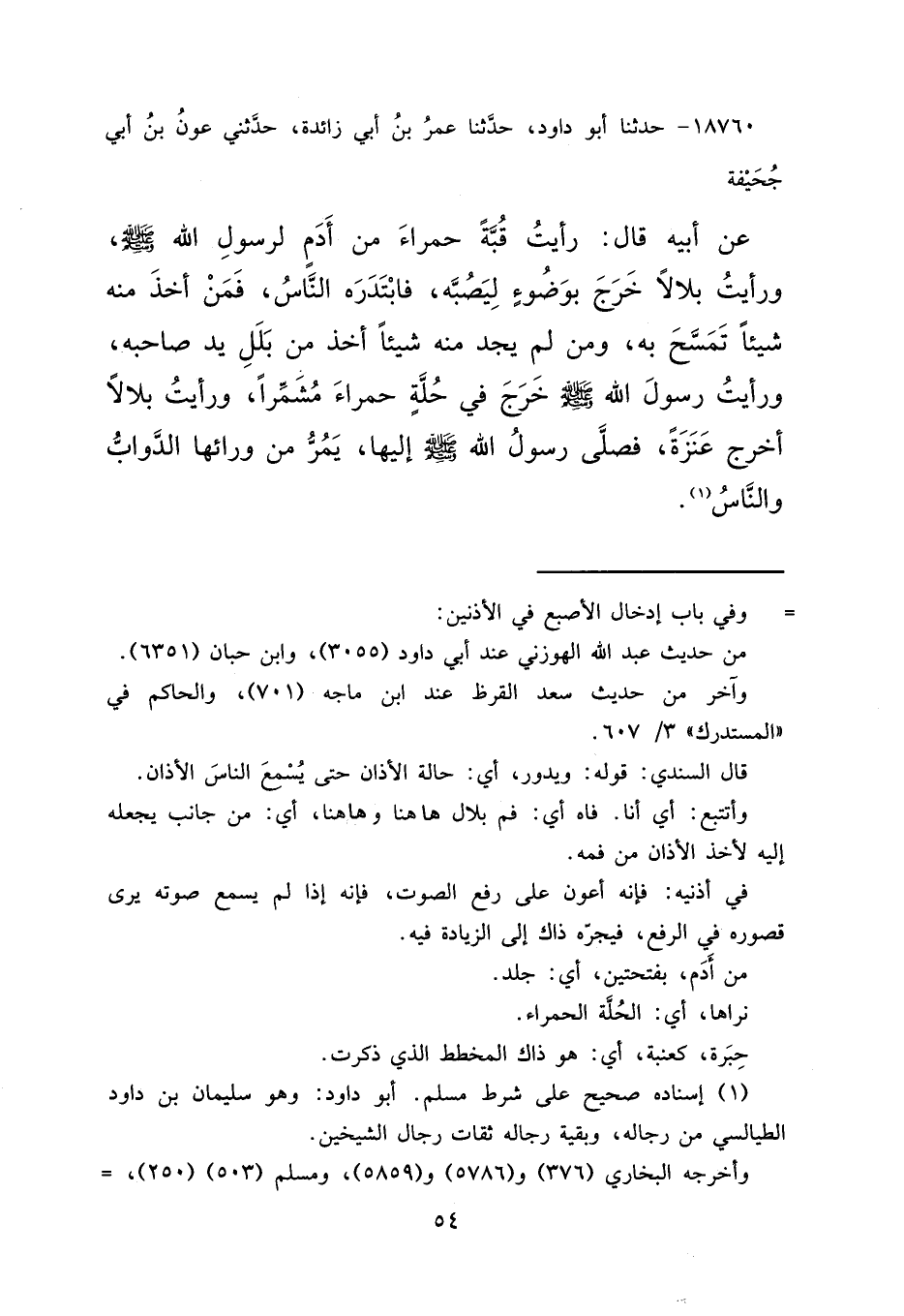 ١٨٧٦٠ - حَدَّثَنَا أَبُو دَاوُدَ، حَدَّثَنَا عُمَرُ بْنُ أَبِي زَائِدَةَ، حَدَّثَنِي عَوْنُ بْنُ أَبِي جُحَيْفَةَ، عَنْ أَبِيهِ قَالَ: " رَأَيْتُ قُبَّةً حَمْرَاءَ مِنْ أَدَمٍ لِرَسُولِ اللهِ صَلَّى اللهُ عَلَيْهِ وَسَلَّمَ، وَرَأَيْتُ بِلَالًا خَرَجَ بِوَضُوءٍ لِيَصُبَّهُ فَابْتَدَرَهُ النَّاسُ، فَمَنْ أَخَذَ مِنْهُ شَيْئًا تَمَسَّحَ بِهِ، وَمَنْ لَمْ يَجِدْ مِنْهُ شَيْئًا أَخَذَ مِنْ بَلَلِ يَدِ صَاحِبِهِ، وَرَأَيْتُ رَسُولَ اللهِ صَلَّى اللهُ عَلَيْهِ وَسَلَّمَ، خَرَجَ فِي حُلَّةٍ حَمْرَاءَ مُشَمِّرًا، وَرَأَيْتُ بِلَالًا أَخْرَجَ عَنَزَةً، فَصَلَّى رَسُولُ اللهِ صَلَّى اللهُ عَلَيْهِ وَسَلَّمَ، إِلَيْهَا يَمُرُّ مِنْ وَرَائِهَا الدَّوَابُّ وَالنَّاسُ " (١)