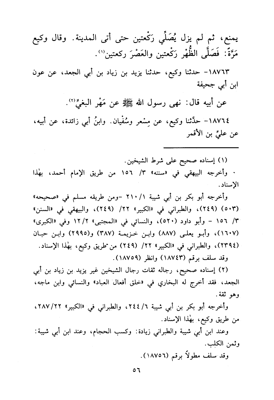 ١٨٧٦٣ - حَدَّثَنَا وَكِيعٌ، حَدَّثَنَا يَزِيدُ بْنُ زِيَادِ بْنِ أَبِي الْجَعْدِ، عَنْ عَوْنِ بْنِ أَبِي جُحَيْفَةَ، عَنْ أَبِيهِ قَالَ: " نَهَى رَسُولُ اللهِ صَلَّى اللهُ عَلَيْهِ وَسَلَّمَ عَنْ مَهْرِ الْبَغِيِّ " (٢)