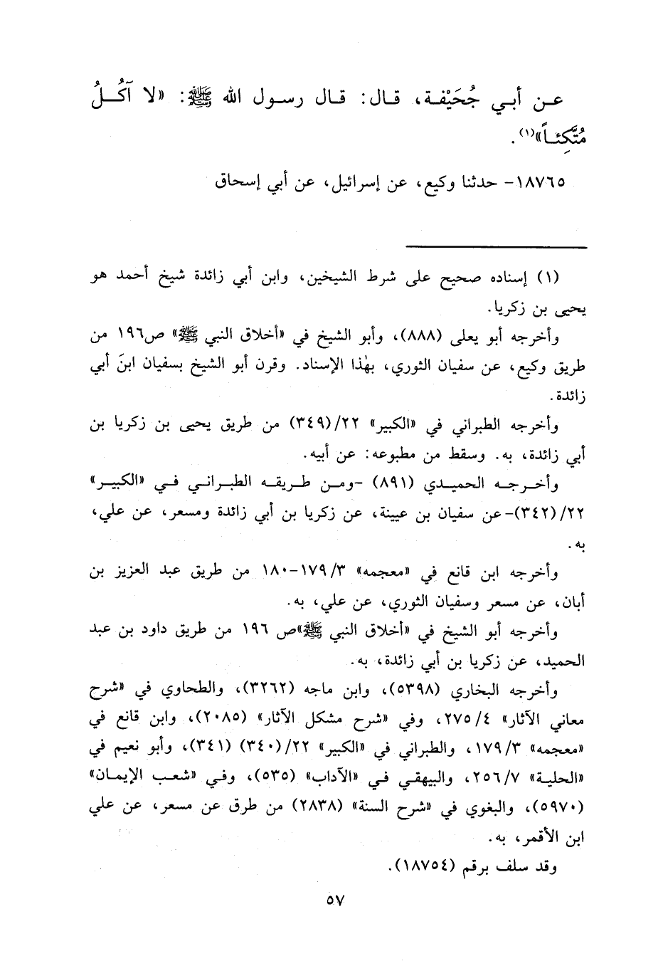 عَنْ أَبِي جُحَيْفَةَ قَالَ: قَالَ رَسُولُ اللهِ صَلَّى اللهُ عَلَيْهِ وَسَلَّمَ: " لَا آكُلُ مُتَّكِئًا " (١)