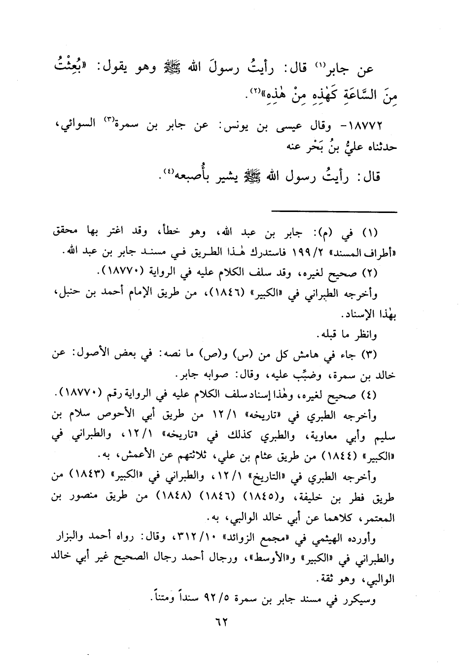 ١٨٧٧٢ - وقَالَ عِيسَى بْنُ يُونُسَ، عَنْ جَابِرِ بْنِ سَمُرَةَ (٣) السُّوَائِيِّ - قَالَ أَبِي -: حَدَّثَنَاهُ عَلِيُّ بْنُ بَحْرٍ عَنْهُ، قَالَ: رَأَيْتُ رَسُولَ اللهِ صَلَّى اللهُ عَلَيْهِ وَسَلَّمَ يُشِيرُ بِإِصْبَعِهِ (٤)
