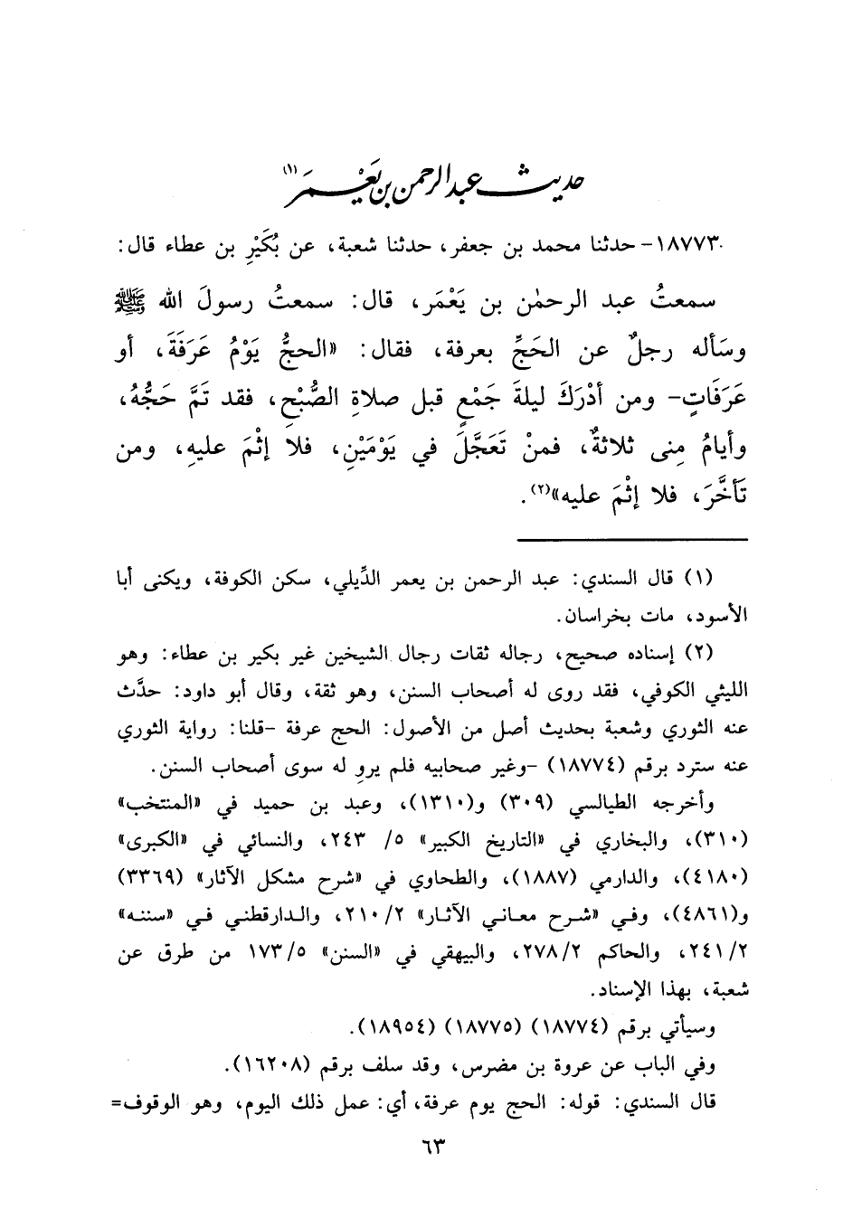 ١٨٧٧٣ - حَدَّثَنَا مُحَمَّدُ بْنُ جَعْفَرٍ، حَدَّثَنَا شُعْبَةُ، عَنْ بُكَيْرِ بْنِ عَطَاءٍ، قَالَ: سَمِعْتُ عَبْدَ الرَّحْمَنِ بْنَ يَعْمَرَ قَالَ: سَمِعْتُ رَسُولَ اللهِ صَلَّى اللهُ عَلَيْهِ وَسَلَّمَ وَسَأَلَهُ رَجُلٌ: عَنِ الْحَجِّ بِعَرَفَةَ، فَقَالَ: " الْحَجُّ يَوْمُ عَرَفَةَ أَوْ عَرَفَاتٍ، وَمَنْ أَدْرَكَ لَيْلَةَ جَمْعٍ قَبْلَ صَلَاةِ الصُّبْحِ، فَقَدْ تَمَّ حَجُّهُ وَأَيَّامُ مِنًى ثَلَاثَةٌ، فَمَنْ تَعَجَّلَ فِي يَوْمَيْنِ، فَلَا إِثْمَ عَلَيْهِ، وَمَنْ تَأَخَّرَ، فَلَا إِثْمَ عَلَيْهِ " (٢)