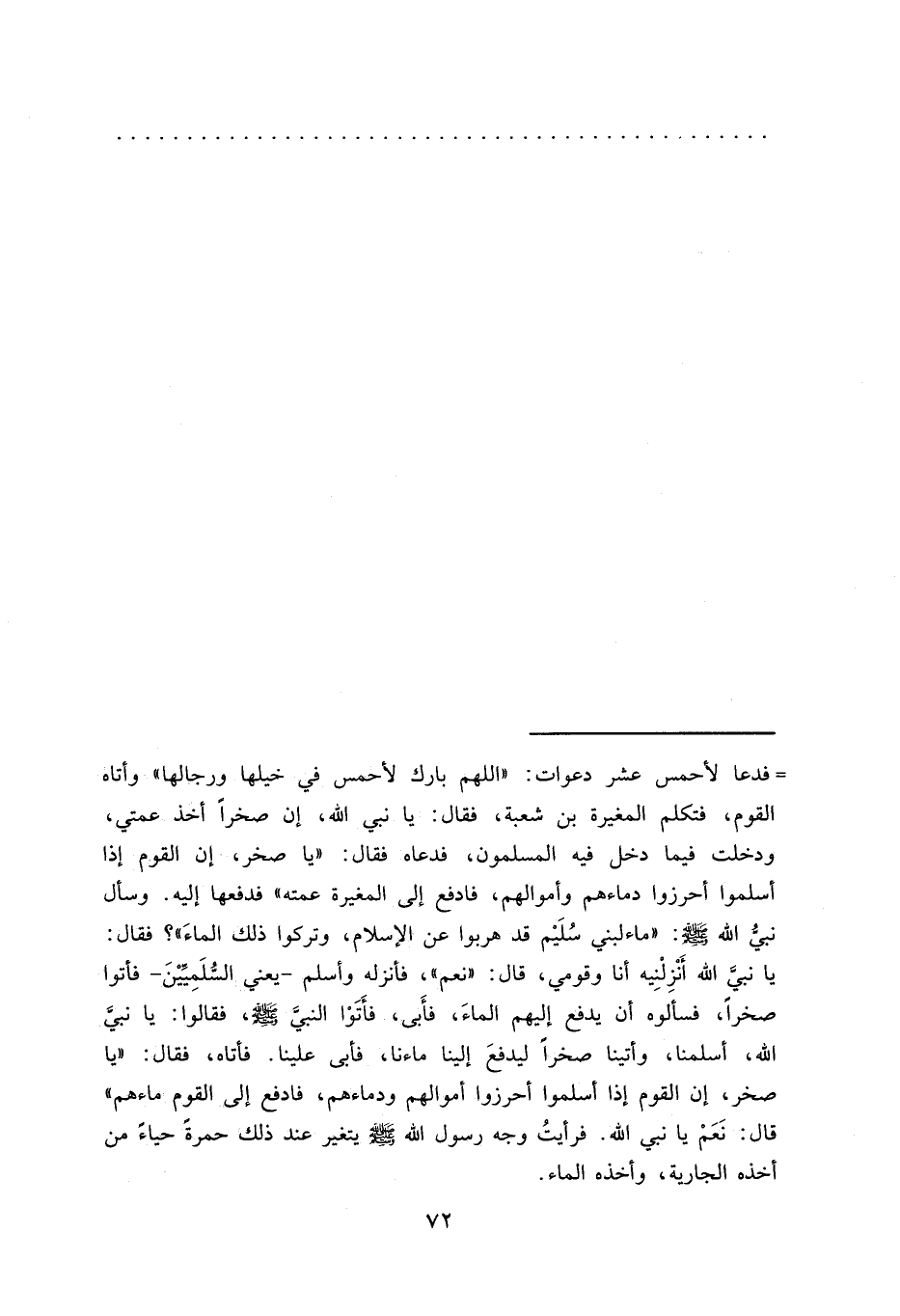 = فدعا لأحمس عشر دعوات: "اللهم بارك لأحمس في خيلها ورجالها" وأتاه القوم، فتكلم المغيرة بن شعبة، فقال: يا نبي الله، إن صخراً أخذ عمتي، ودخلت فيما دخل فيه المسلمون، فدعاه فقال: "يا صخر، إن القوم إذا أسلموا أحرزوا دماءهم وأموالهم، فادفع إلى المغيرة عمته" (فدفعها إليه. وسأل