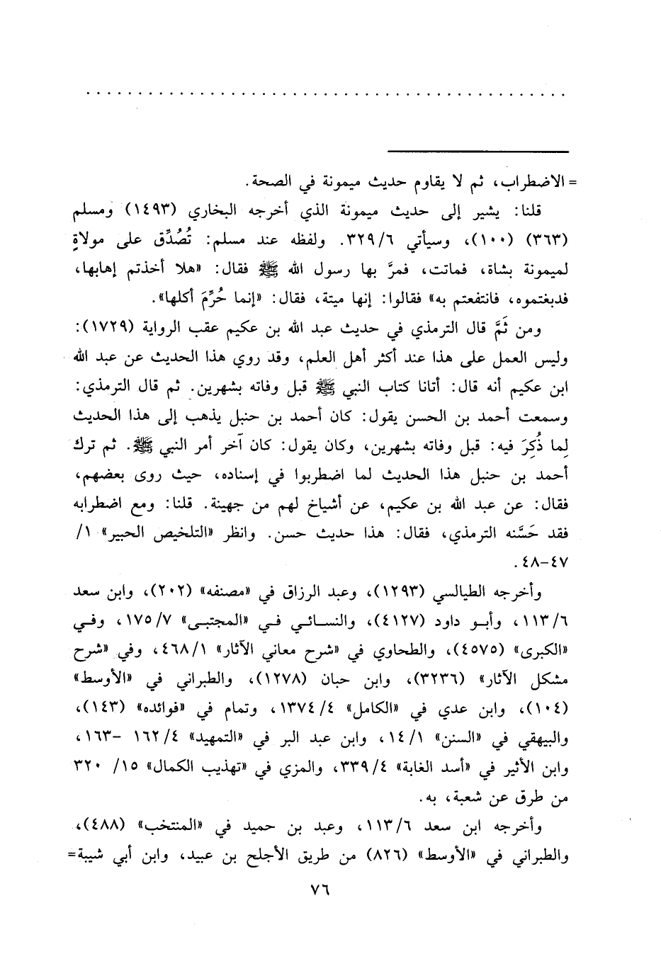 ومن ثَمَّ قال الترمذي في حديث عبد الله بن عكيم عقب الرواية (١٧٢٩) : وليس العمل على هذا عند أكثر أهل العلم، وقد روي هذا الحديث عن عبد الله ابن عكيم أنه قال: أتانا كتاب النبي صَلَّى اللهُ عَلَيْهِ وَسَلَّمَ قبل وفاته بشهرين. ثم قال الترمذي: وسمعت أحمد بن الحسن يقول: كان أحمد بن حنبل يذهب إلى هذا الحديث لِما ذُكِرَ فيه: قبل وفاته بشهرين، وكان يقول: كان آخر أمر النبي صَلَّى اللهُ عَلَيْهِ وَسَلَّمَ. ثم ترك أحمد بن حنبل هذا الحديث لما اضطربوا في إسناده، حيث روى بعضهم،