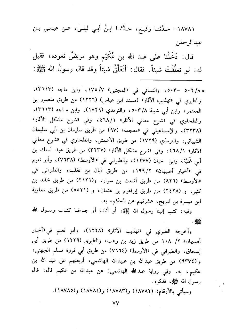 ١٨٧٨١ - حَدَّثَنَا وَكِيعٌ، حَدَّثَنَا ابْنُ أَبِي لَيْلَى، عَنْ أَخِيهِ عِيسَى بْنِ عَبْدِ الرَّحْمَنِ قَالَ: دَخَلْنَا عَلَى عَبْدِ اللهِ بْنِ عُكَيْمٍ وَهُوَ مَرِيضٌ نَعُودُهُ فَقِيلَ لَهُ: لَوْ تَعَلَّقْتَ شَيْئًا، فَقَالَ: أَتَعَلَّقُ شَيْئًا، وَقَدْ قَالَ رَسُولُ اللهِ صَلَّى اللهُ عَلَيْهِ وَسَلَّمَ: "