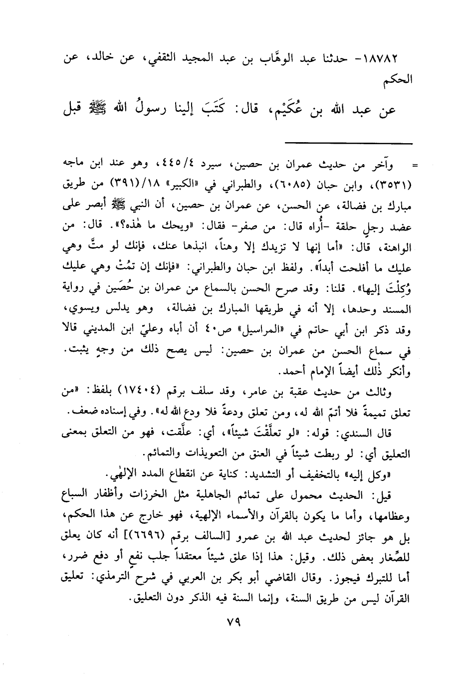قيل: الحديث محمول على تمائم الجاهلية مثل الخرزات وأظفار السباع وعظامها، وأما ما يكون بالقرآن والأسماء الإلهية، فهو خارج عن هذا الحكم، بل هو جائز لحديث عبد الله بن عمرو [السالف برقم (٦٦٩٦) ] أنه كان يعلق للصغار بعض ذلك. وقيل: هذا إذا علق شيئاً معتقداً جلب نفعٍ أو دفع ضرر، أما للتبرك فيجوز. وقال القاضي أبو بكر بن العربي في شرح الترمذي: تعليق القرآن ليس من طريق السنة، وإنما السنة فيه الذكر دون التعليق.