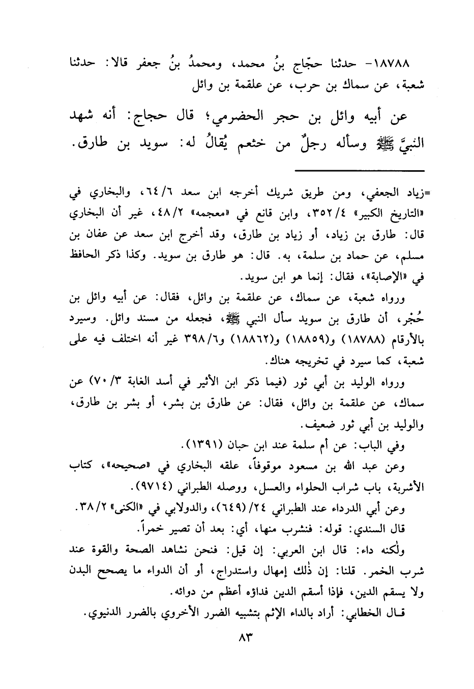 ١٨٧٨٨ - حَدَّثَنَا حَجَّاجُ بْنُ مُحَمَّدٍ، وَمُحَمَّدُ بْنُ جَعْفَرٍ، قَالَا: حَدَّثَنَا شُعْبَةُ، عَنْ سِمَاكِ بْنِ حَرْبٍ، عَنْ عَلْقَمَةَ بْنِ وَائِلٍ، عَنْ أَبِيهِ وَائِلِ بْنِ حُجْرٍ الْحَضْرَمِيِّ، قَالَ حَجَّاجٌ: إِنَّهُ شَهِدَ النَّبِيَّ صَلَّى اللهُ عَلَيْهِ وَسَلَّمَ، وَسَأَلَهُ رَجُلٌ مِنْ خَثْعَمٍ يُقَالُ لَهُ: سُوَيْدُ بْنُ طَارِقٍ،