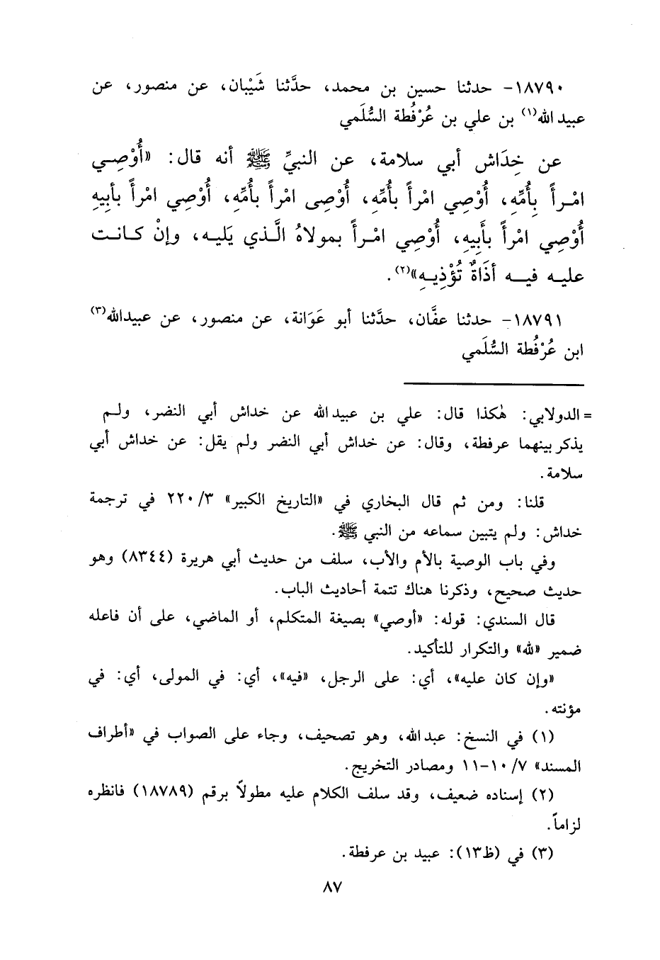 = الدولابي: هكذا قال: علي بن عبيد الله عن خداش أبي النضر، ولم يذكر بينهما عرفطة، وقال: عن خداش أبي النضر ولم يقل: عن خداش أبي سلامة.