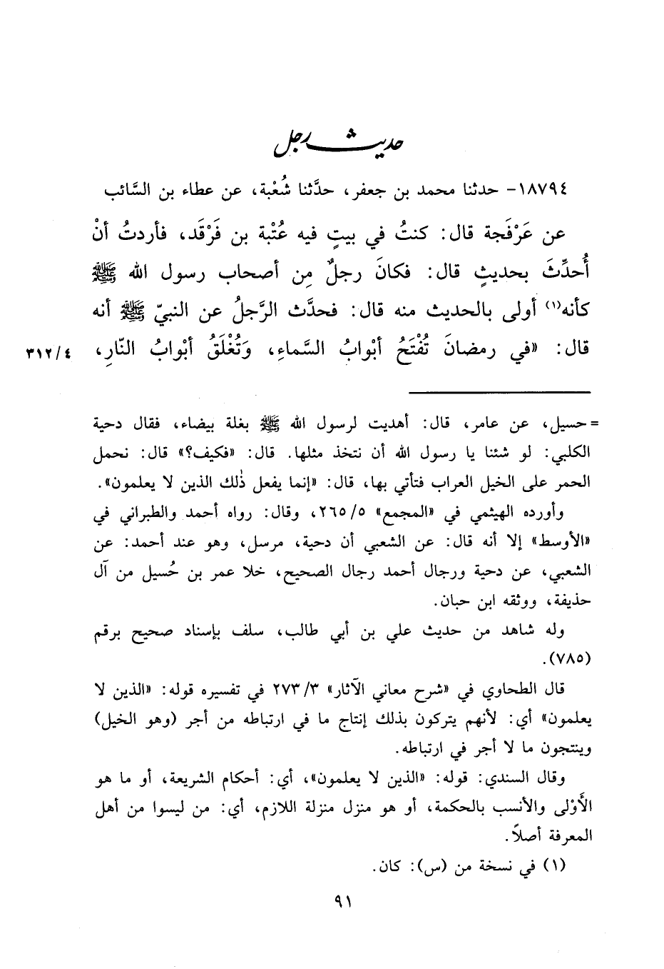 ١٨٧٩٤ - حَدَّثَنَا مُحَمَّدُ بْنُ جَعْفَرٍ، حَدَّثَنَا شُعْبَةُ، عَنْ عَطَاءِ بْنِ السَّائِبِ، عَنْ عَرْفَجَةَ قَالَ: " كُنْتُ فِي بَيْتٍ فِيهِ عُتْبَةُ بْنُ فَرْقَدٍ، فَأَرَدْتُ أَنْ أُحَدِّثَ بِحَدِيثٍ، قَالَ: فَكَانَ رَجُلٌ مِنْ أَصْحَابِ رَسُولِ اللهِ صَلَّى اللهُ عَلَيْهِ وَسَلَّمَ، كَأَنَّهُ (١) أَوْلَى بِالْحَدِيثِ مِنْهُ، قَالَ: فَحَدَّثَ الرَّجُلُ، عَنِ النَّبِيِّ صَلَّى اللهُ عَلَيْهِ وَسَلَّمَ أَنَّهُ قَالَ: " فِي رَمَضَانَ تُفَتَّحُ أَبْوَابُ السَّمَاءِ، وَتُغَلَّقُ أَبْوَابُ النَّارِ،