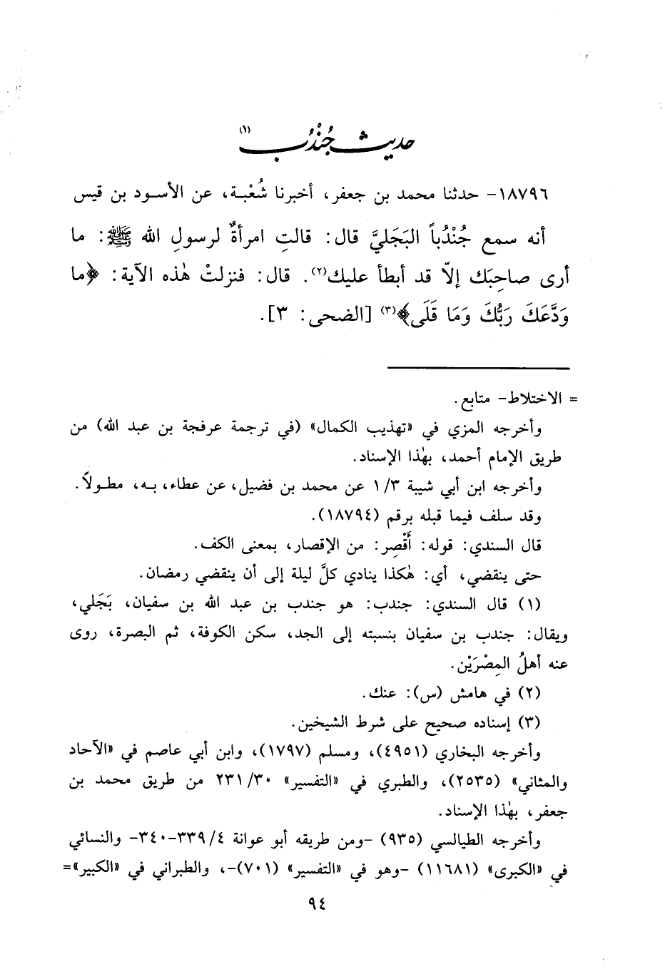 (١) قال السندي: جندب: هو جندب بن عبد الله بن سفيان، بَجَلي، ويقال: جندب بن سفيان بنسبته إلى الجد، سكن الكوفة، ثم البصرة، روى عنه أهلُ المِصْرَيْن.