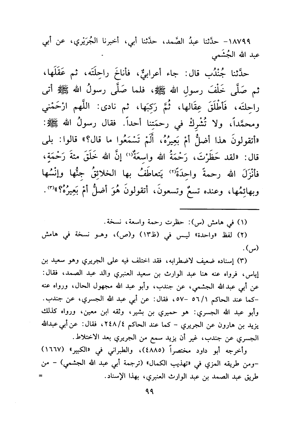 ١٨٧٩٩ - حَدَّثَنَا عَبْدُ الصَّمَدِ، حَدَّثَنَا أَبِي، أَخْبَرَنَا الْجُرَيْرِيُّ، عَنِ أَبِي عَبْدِ اللهِ الْجُشَمِيِّ، حَدَّثَنَا جُنْدُبٌ قَالَ: جَاءَ أَعْرَابِيٌّ فَأَنَاخَ رَاحِلَتَهُ، ثُمَّ عَقَلَهَا، ثُمَّ صَلَّى خَلْفَ رَسُولِ اللهِ صَلَّى اللهُ عَلَيْهِ وَسَلَّمَ، فَلَمَّا صَلَّى رَسُولُ اللهِ صَلَّى اللهُ عَلَيْهِ وَسَلَّمَ، أَتَى رَاحِلَتَهُ، فَأَطْلَقَ عِقَالَهَا ثُمَّ رَكِبَهَا، ثُمَّ نَادَى: اللهُمَّ ارْحَمْنِي وَمُحَمَّدًا، وَلَا تُشْرِكْ فِي رَحْمَتِنَا أَحَدًا، فَقَالَ رَسُولُ اللهِ صَلَّى اللهُ عَلَيْهِ وَسَلَّمَ: " أَتَقُولُونَ هَذَا أَضَلُّ أَمْ بَعِيرُهُ، أَلَمْ تَسْمَعُوا مَا قَالَ؟ " " قَالُوا: بَلَى، قَالَ: " لَقَدْ حَظَرْتَ رَحْمَةُ اللهِ وَاسِعَةٌ، (١) إِنَّ اللهَ خَلَقَ مِائَةَ رَحْمَةٍ، فَأَنْزَلَ اللهُ رَحْمَةً وَاحِدَةً (٢) يَتَعَاطَفُ بِهَا الْخَلَائِقُ، جِنُّهَا وَإِنْسُهَا وَبَهَائِمُهَا، وَعِنْدَهُ تِسْعٌ وَتِسْعُونَ، أَتَقُولُونَ هُوَ أَضَلُّ أَمْ بَعِيرُهُ؟ " (٣)