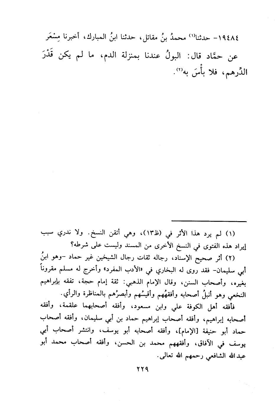١٩٤٨٤ - حَدَّثَنَا (١) مُحَمَّدُ بْنُ مُقَاتِلٍ، حَدَّثَنَا ابْنُ الْمُبَارَكِ، أَخْبَرَنَا مِسْعَرٌ، عَنْ حَمَّادٍ، قَالَ: " الْبَوْلُ عِنْدَنَا بِمَنْزِلَةِ الدَّمِ، مَا لَمْ يَكُنْ قَدْرَ الدِّرْهَمِ فَلَا بَأْسَ بِهِ " (٢)