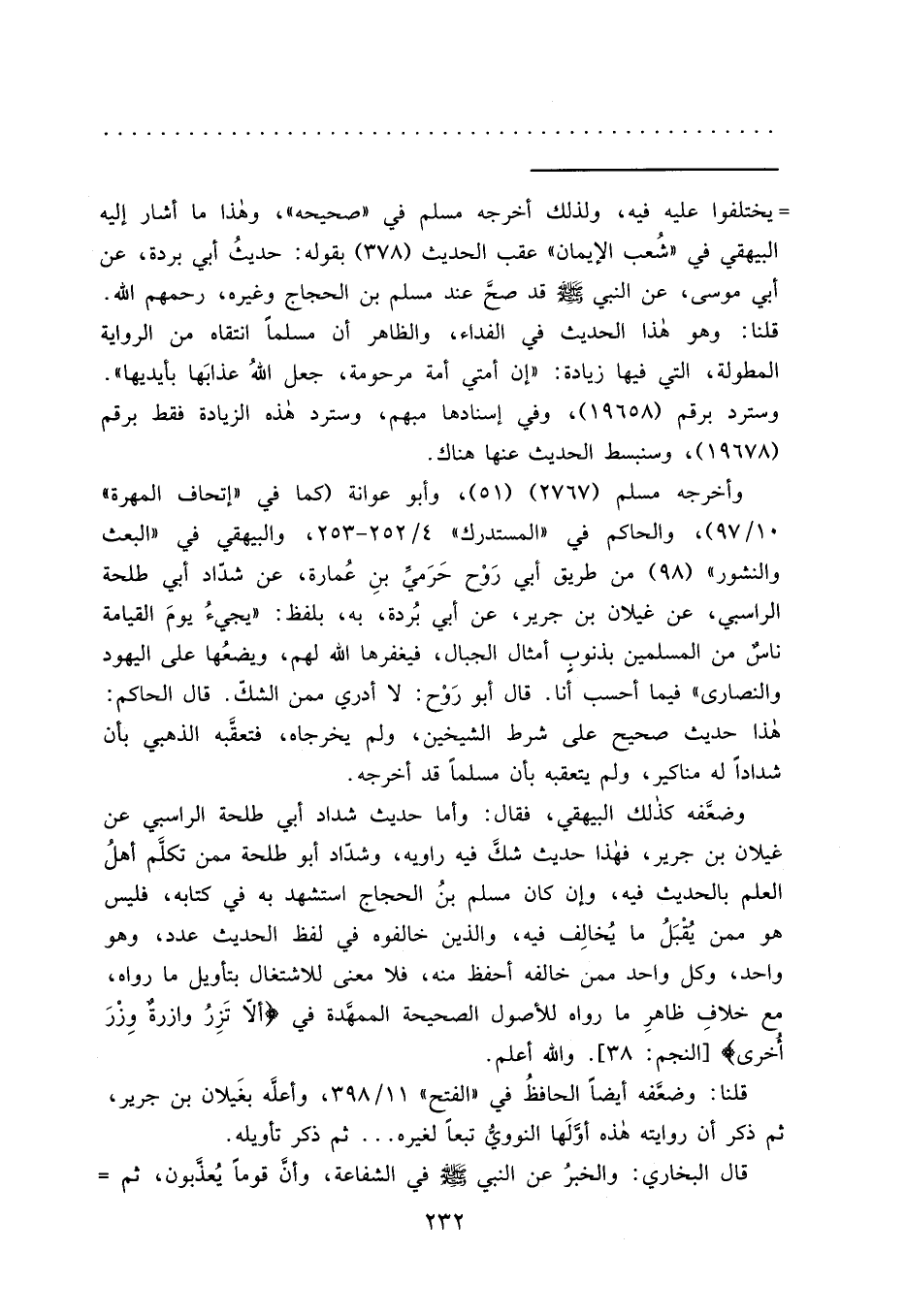 قلنا: وهو هذا الحديث في الفداء، والظاهر أن مسلماَ انتقاه من الرواية المطولة، التي فيها زيادة: "إن أمتي أمة مرحومة، جعل اللهُ عذابَها بأيديها".