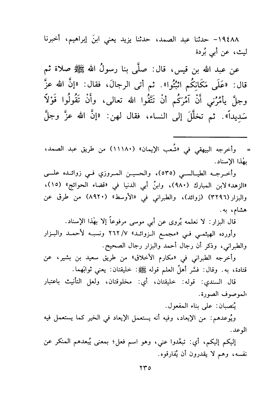 ١٩٤٨٨ - حَدَّثَنَا عَبْدُ الصَّمَدِ، حَدَّثَنَا يَزِيدُ يَعْنِي ابْنَ إِبْرَاهِيمَ، أَخْبَرَنَا لَيْثٌ، عَنْ أَبِي بُرْدَةَ، عَنْ عَبْدِ اللهِ بْنِ قَيْسٍ قَالَ: صَلَّى بِنَا رَسُولُ اللهِ صَلَّى اللهُ عَلَيْهِ وَسَلَّمَ صَلَاةً ثُمَّ، قَالَ: عَلَى مَكَانِكُمْ اثْبُتُوا، ثُمَّ أَتَى الرِّجَالَ، فَقَالَ: " إِنَّ اللهَ عَزَّ وَجَلَّ يَأْمُرُنِي أَنْ آمُرَكُمْ أَنْ تَتَّقُوا اللهَ تَعَالَى، وَأَنْ تَقُولُوا قَوْلًا سَدِيدًا "، ثُمَّ تَخَلَّلَ إِلَى النِّسَاءِ، فَقَالَ لَهُنَّ: " إِنَّ اللهَ عَزَّ وَجَلَّ