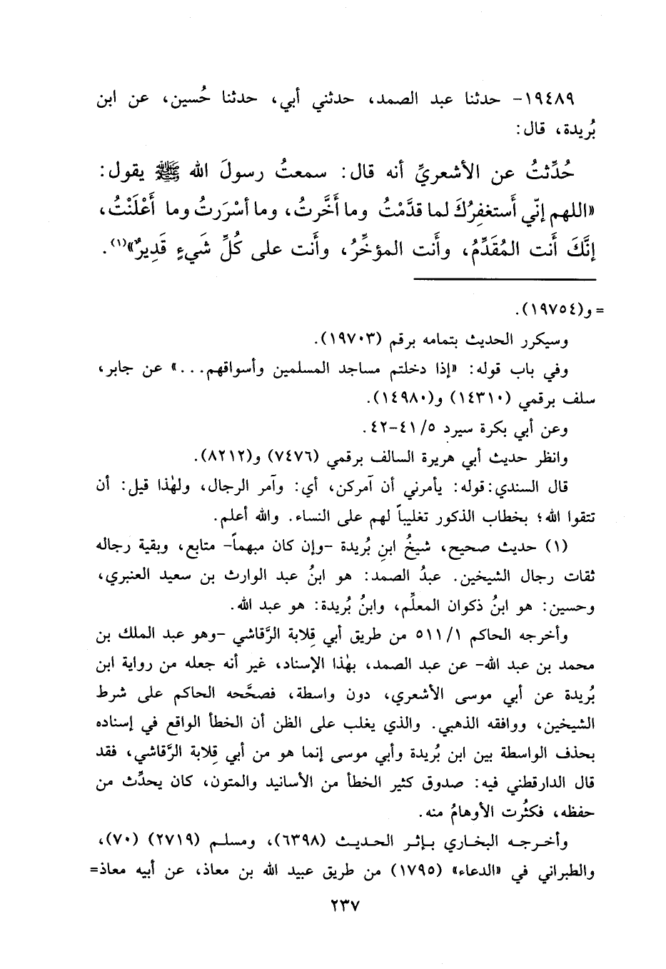 ١٩٤٨٩ - حَدَّثَنَا عَبْدُ الصَّمَدِ، حِدَّثَنِي أَبِي، حَدَّثَنَا حُسَيْنٌ، عَنِ ابْنِ بُرَيْدَةَ، قَالَ: حُدِّثْتُ عَنِ الْأَشْعَرِيِّ أَنَّهُ قَالَ: سَمِعْتُ رَسُولَ اللهِ صَلَّى اللهُ عَلَيْهِ وَسَلَّمَ يَقُولُ: " اللهُمَّ إِنِّي أَسْتَغْفِرُكَ لِمَا قَدَّمْتُ، وَمَا أَخَّرْتُ، وَمَا أَسْرَرْتُ، وَمَا أَعْلَنْتُ، إِنَّكَ أَنْتَ الْمُقَدِّمُ، وَأَنْتَ الْمُؤَخِّرُ، وَأَنْتَ عَلَى كُلِّ شَيْءٍ قَدِيرٌ " (١)