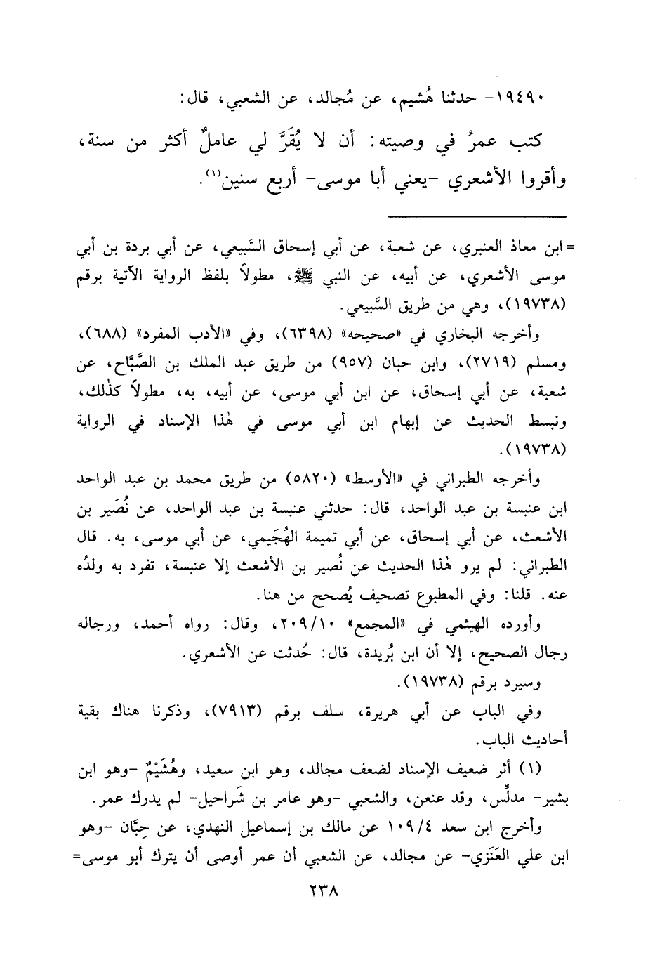 وأخرج ابن سعد ٤/١٠٩ عن مالك بن إسماعيل النهدي، عن حِبَّان- وهو ابن علي العَنَزي- عن مجالد، عن الشعبي أن عمر أوصى أن يترك أبو موسى=