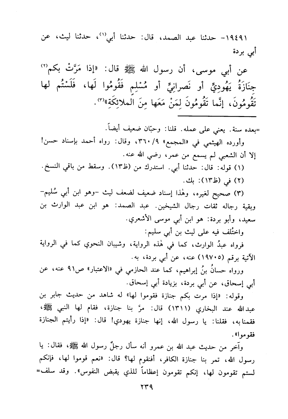١٩٤٩١ - حَدَّثَنَا عَبْدُ الصَّمَدِ، قَالَ: حَدَّثَنَا أَبِي (١) حَدَّثَنَا لَيْث، عَنْ أَبِي بُرْدَةَ، عَنْ أَبِي مُوسَى، أَنَّ رَسُولَ اللهِ صَلَّى اللهُ عَلَيْهِ وَسَلَّمَ قَالَ: " إِذَا مَرَّتْ بِكُمْ (٢) جِنَازَةُ يَهُودِيٍّ أَوْ نَصْرَانِيٍّ أَوْ مُسْلِمٍ فَقُومُوا لَهَا، فَلَسْتُمْ لَهَا تَقُومُونَ، إِنَّمَا تَقُومُونَ لِمَنْ مَعَهَا مِنَ الْمَلَائِكَةِ " (٣)