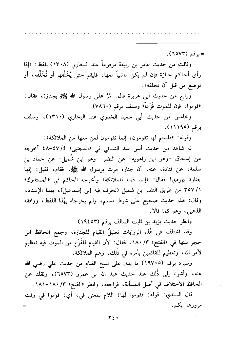 وثالث من حديث عامر بن ربيعة مرفوعاً عند البخاري (١٣٠٨) بلفظ: "إذا رأى أحدكم جنازة فإن لم يكن ماشياً معها، فليقم حتى يُخَلَّفها أو تُخَلَفه، أو توضع من قبل أن تخلفه".