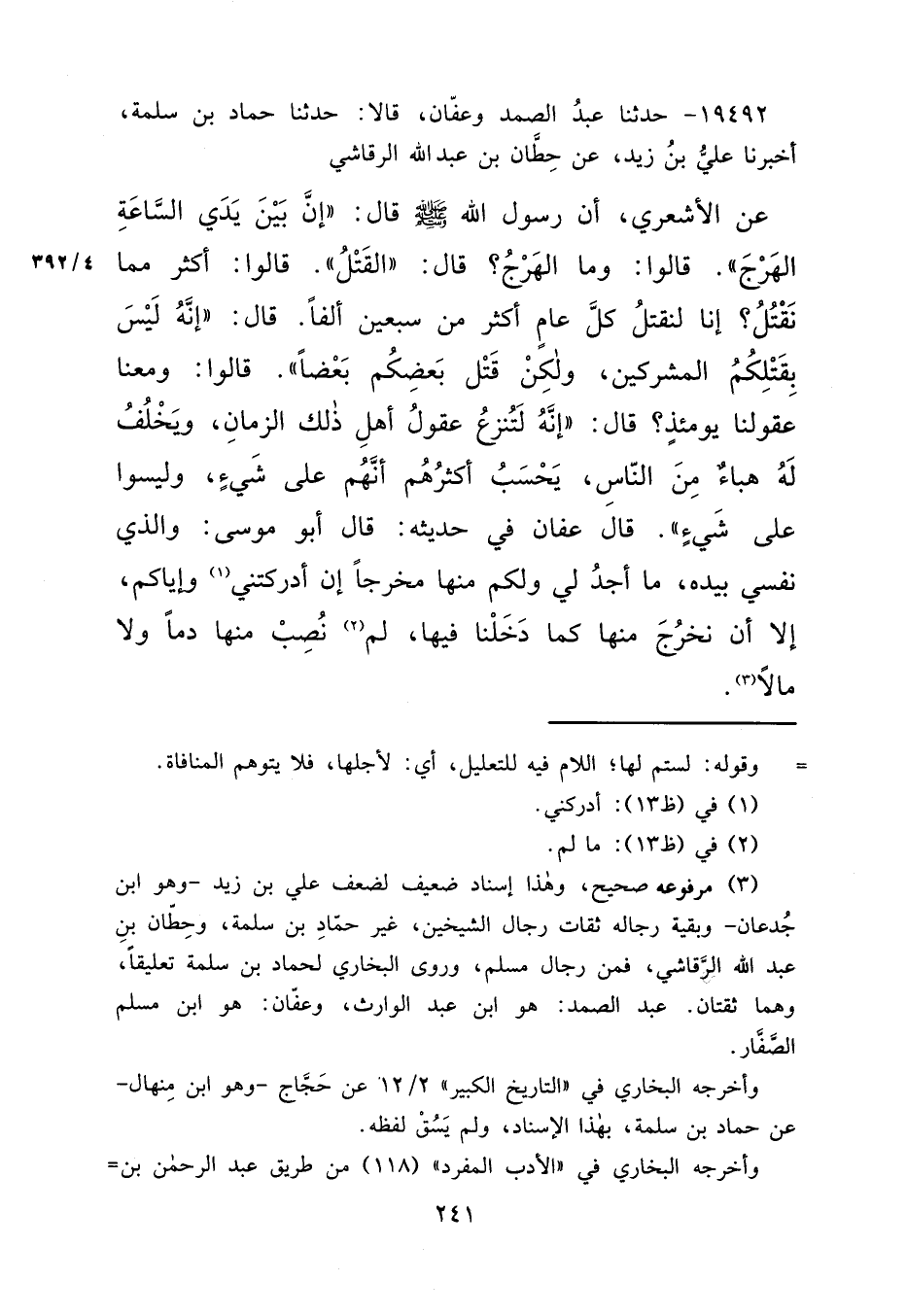 ١٩٤٩٢ - حَدَّثَنَا عَبْدُ الصَّمَدِ، وَعَفَّانُ، قَالَا: حَدَّثَنَا حَمَّادُ بْنُ سَلَمَةَ، أَخْبَرَنَا عَلِيُّ بْنُ زَيْدٍ، عَنْ حِطَّانَ بْنِ عَبْدِ اللهِ الرَّقَاشِيِّ، عَنِ الْأَشْعَرِيِّ، أَنَّ رَسُولَ اللهِ صَلَّى اللهُ عَلَيْهِ وَسَلَّمَ قَالَ: " إِنَّ بَيْنَ يَدَيِ السَّاعَةِ الْهَرْجَ ". قَالُوا: وَمَا الْهَرْجُ؟ قَالَ: " الْقَتْلُ ". قَالُوا: أَكْثَرُ مِمَّا نَقْتُلُ، إِنَّا لَنَقْتُلُ كُلَّ عَامٍ أَكْثَرَ مِنْ سَبْعِينَ أَلْفًا، قَالَ: " إِنَّهُ لَيْسَ بِقَتْلِكُمُ الْمُشْرِكِينَ، وَلَكِنْ قَتْلُ بَعْضِكُمْ بَعْضًا "، قَالُوا: وَمَعَنَا عُقُولُنَا يَوْمَئِذٍ؟ قَالَ: " إِنَّهُ لَتُنْزَعُ عُقُولُ أَهْلِ ذَلِكَ الزَّمَانِ، وَيُخَلَّفُ لَهُ هَبَاءٌ مِنَ النَّاسِ، يَحْسِبُ أَكْثَرُهُمْ أَنَّهُمْ عَلَى شَيْءٍ، وَلَيْسُوا عَلَى شَيْءٍ " قَالَ عَفَّانُ: فِي حَدِيثِهِ قَالَ أَبُو مُوسَى: " وَالَّذِي نَفْسِي بِيَدِهِ مَا أَجِدُ لِي وَلَكُمْ مِنْهَا مَخْرَجًا، إِنْ أَدْرَكَتْنِي (١) وَإِيَّاكُمْ، إِلَّا أَنْ نَخْرُجَ مِنْهَا كَمَا دَخَلْنَا فِيهَا لَمْ (٢) نُصِبْ مِنْهَا دَمًا وَلَا مَالًا " (٣)