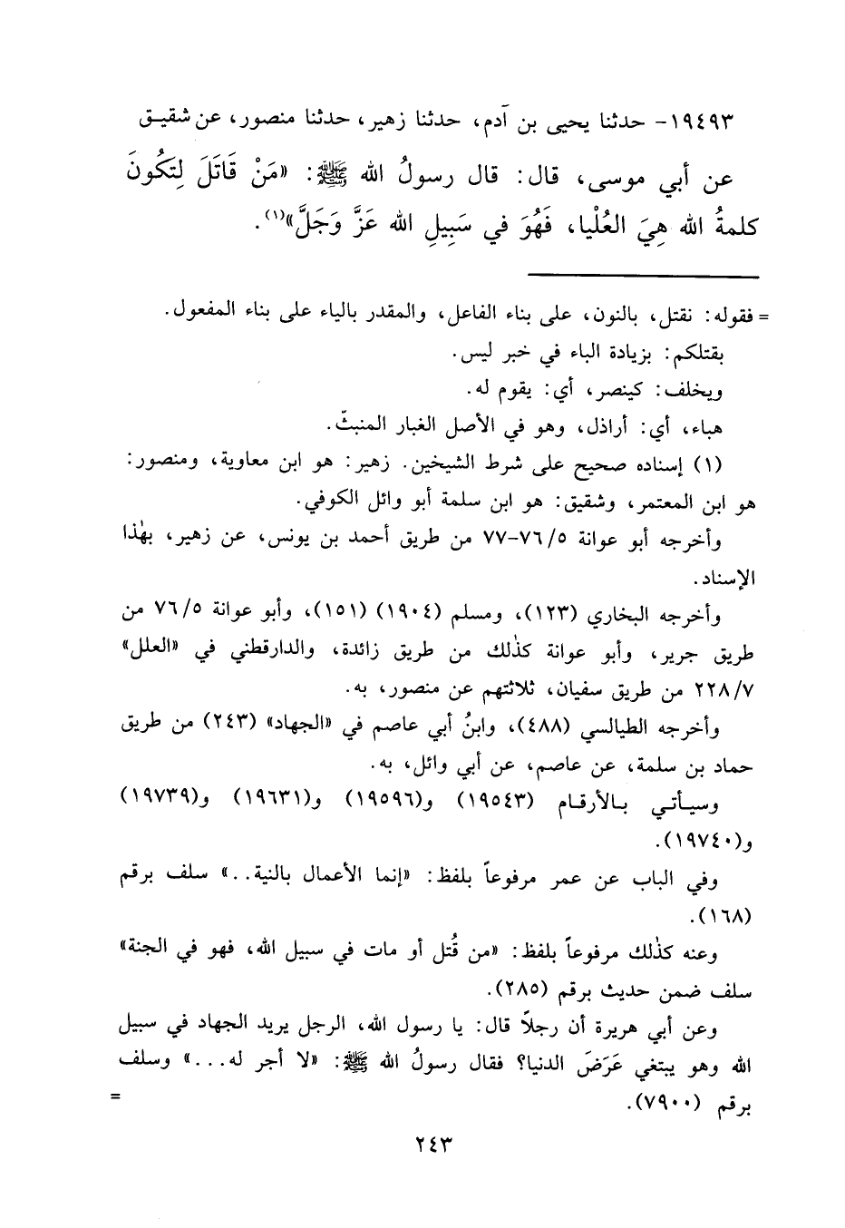 ١٩٤٩٣ - حَدَّثَنَا يَحْيَى بْنُ آدَمَ، حَدَّثَنَا زُهَيْرٌ، حَدَّثَنَا مَنْصُورٌ، عَنْ شَقِيقٍ، عَنْ أَبِي مُوسَى قَالَ: قَالَ رَسُولُ اللهِ صَلَّى اللهُ عَلَيْهِ وَسَلَّمَ: " مَنْ قَاتَلَ لِتَكُونَ كَلِمَةُ اللهِ هِيَ الْعُلْيَا، فَهُوَ فِي سَبِيلِ اللهِ عَزَّ وَجَلَّ " (١)