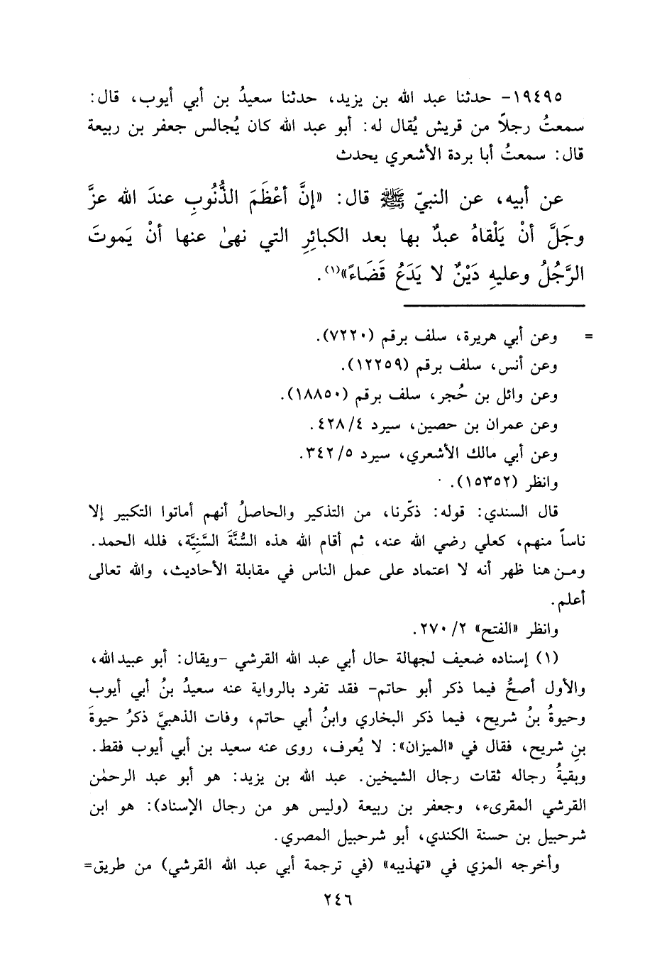 ١٩٤٩٥ - حَدَّثَنَا عَبْدُ اللهِ بْنُ يَزِيدَ، حَدَّثَنَا سَعِيدُ بْنُ أَبِي أَيُّوبَ، قَالَ: سَمِعْتُ رَجُلًا مِنْ قُرَيْشٍ يُقَالُ لَهُ: أَبُو عَبْدِ اللهِ: كَانَ يُجَالِسُ جَعْفَرَ بْنَ رَبِيعَةَ، قَالَ: سَمِعْتُ أَبَا بُرْدَةَ الْأَشْعَرِيَّ، يُحَدِّثُ، عَنْ أَبِيهِ، عَنِ النَّبِيِّ صَلَّى اللهُ عَلَيْهِ وَسَلَّمَ قَالَ: " إِنَّ أَعْظَمَ الذُّنُوبِ عِنْدَ اللهِ عَزَّ وَجَلَّ، أَنْ يَلْقَاهُ عَبْدٌ بِهَا بَعْدَ الْكَبَائِرِ الَّتِي نَهَى عَنْهَا، أَنْ يَمُوتَ الرَّجُلُ وَعَلَيْهِ دَيْنٌ لَا يَدَعُ قَضَاءً " (١)