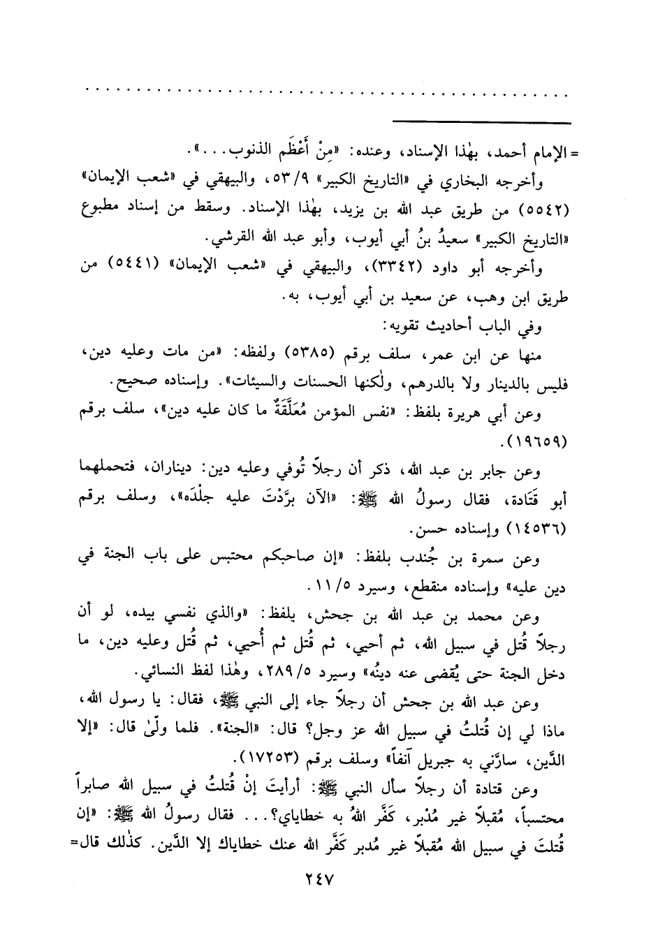 وعن عبد الله بن جحش أن رجلاً جاء إلى النبي صَلَّى اللهُ عَلَيْهِ وَسَلَّمَ، فقال: يا رسول الله، ماذا لي إن قُتلتُ في سبيل الله عز وجل؟ قال: "الجنة". فلما ولّى قال: "إلا الدَّين، سارَّني به جبريل آنفاً" وسلف برقم (١٧٢٥٣) .