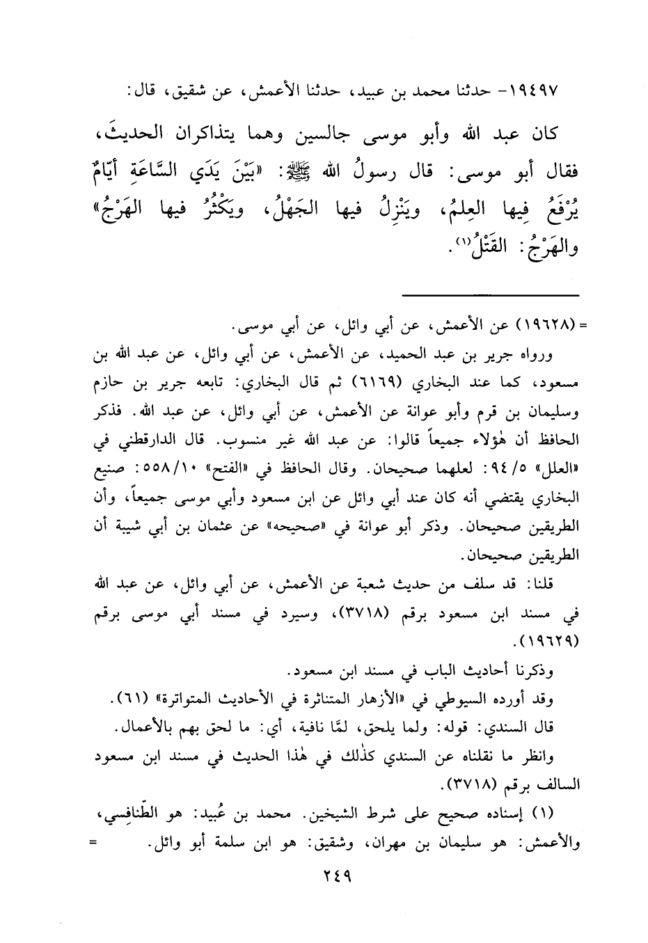١٩٤٩٧ - حَدَّثَنَا مُحَمَّدُ بْنُ عُبَيْدٍ، حَدَّثَنَا الْأَعْمَشُ، عَنْ شَقِيقٍ، قَالَ: كَانَ عَبْدُ اللهِ وَأَبُو مُوسَى جَالِسَيْنِ وَهُمَا يَتَذَاكَرَانِ الْحَدِيثَ، فَقَالَ أَبُو مُوسَى: قَالَ رَسُولُ اللهِ صَلَّى اللهُ عَلَيْهِ وَسَلَّمَ: " بَيْنَ يَدَيِ السَّاعَةِ أَيَّامٌ، يُرْفَعُ فِيهَا الْعِلْمُ، وَيَنْزِلُ فِيهَا الْجَهْلُ، وَيَكْثُرُ فِيهَا الْهَرْجُ " وَالْهَرْجُ: الْقَتْلُ (١)