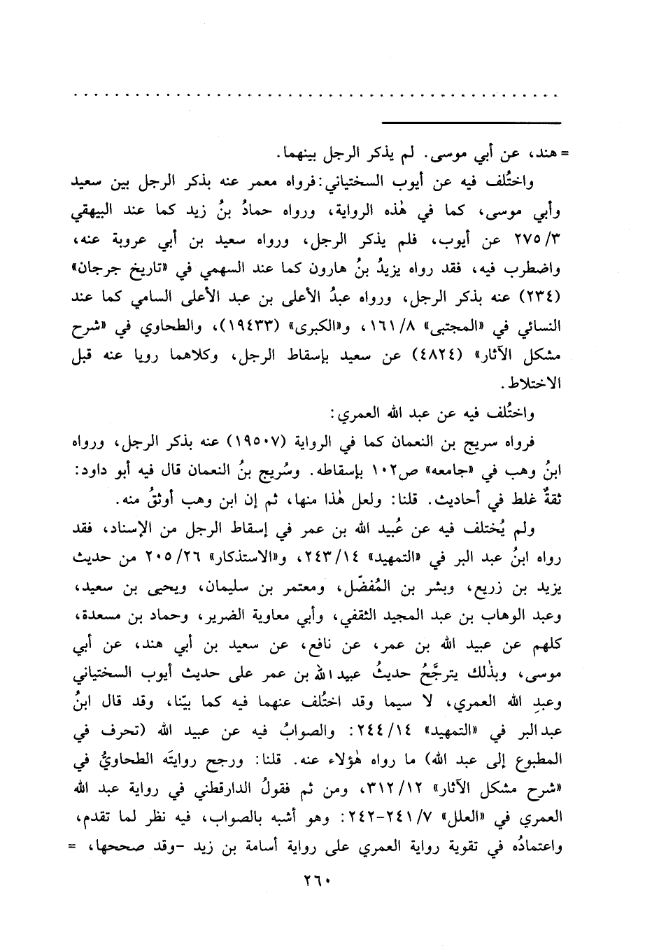 ولم يُختلف فيه عن عُبيد الله بن عمر في إسقاط الرجل من الإسناد، فقد رواه ابنُ عبد البر في "التمهيد" ١٤/٢٤٣، و"الاستذكار" ٢٦/٢٠٥ من حديث يزيد بن زريع، وبشر بن المُفضّل، ومعتمر بن سليمان، ويحيى بن سعيد، وعبد الوهاب بن عبد المجيد الثقفي، وأبي معاوية الضرير، وحماد بن مسعدة، كلهم عن عبيد الله بن عمر، عن نافع، عن سعيد بن أبي هند، عن أبي موسى، وبذلك يترجَّحُ حديثُ عبيد الله بن عمر على حديث أيوب السختياني وعبدِ الله العمري، لا سيما وقد اختُلف عنهما فيه كما بيّنا، وقد قال ابن عبد البر في "التمهيد" ١٤/٢٤٤: والصوابُ فيه عن عبيد الله (تحرف في المطبوع إلى عبد الله) ما رواه هؤلاء عنه. قلنا: ورجح روايتَه الطحاويُّ في "شرح مشكل الآثار" ١٢/٣١٢، ومن ثم فقولُ الدارقطني في رواية عبد الله العمري في "العلل" ٧/٢٤١-٢٤٢: وهو أشبه بالصواب، فيه نظر لما تقدم، واعتمادُه في تقوية رواية العمري على رواية أسامة بن زيد- وقد صححها،=