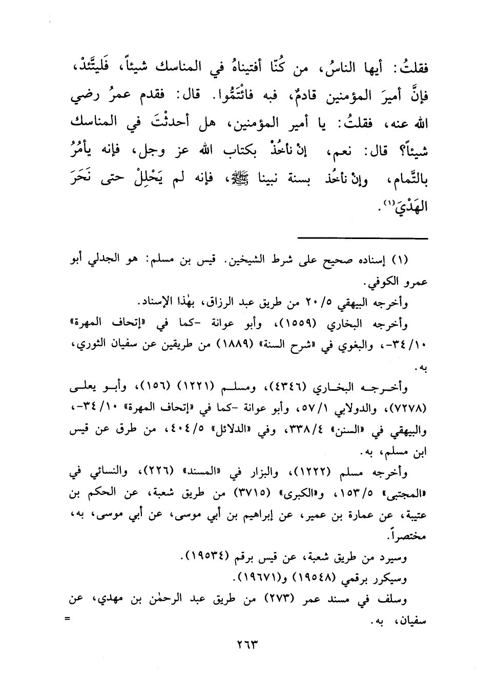 فَقُلْتُ: أَيُّهَا النَّاسُ مَنْ كُنَّا أَفْتَيْنَاهُ فِي الْمَنَاسِكِ شَيْئًا، فَلْيَتَّئِدْ، فَإِنَّ أَمِيرَ الْمُؤْمِنِينَ قَادِمٌ فَبِهِ فَائْتَمُّوا، قَالَ: فَقَدِمَ عُمَرُ رَضِيَ اللهُ عَنْهُ، فَقُلْتُ: يَا أَمِيرَ الْمُؤْمِنِينَ، هَلْ أَحْدَثْتَ فِي الْمَنَاسِكِ شَيْئًا؟ قَالَ: نَعَمْ، إِنْ نَأْخُذَ بِكِتَابِ اللهِ عَزَّ وَجَلَّ، فَإِنَّهُ يَأْمُرُ بِالتَّمَامِ، وَإِنْ نَأْخُذَ بِسُنَّةِ نَبِيِّنَا صَلَّى اللهُ عَلَيْهِ وَسَلَّمَ، فَإِنَّهُ لَمْ يَحْلِلْ حَتَّى نَحَرَ الْهَدْيَ " (١)