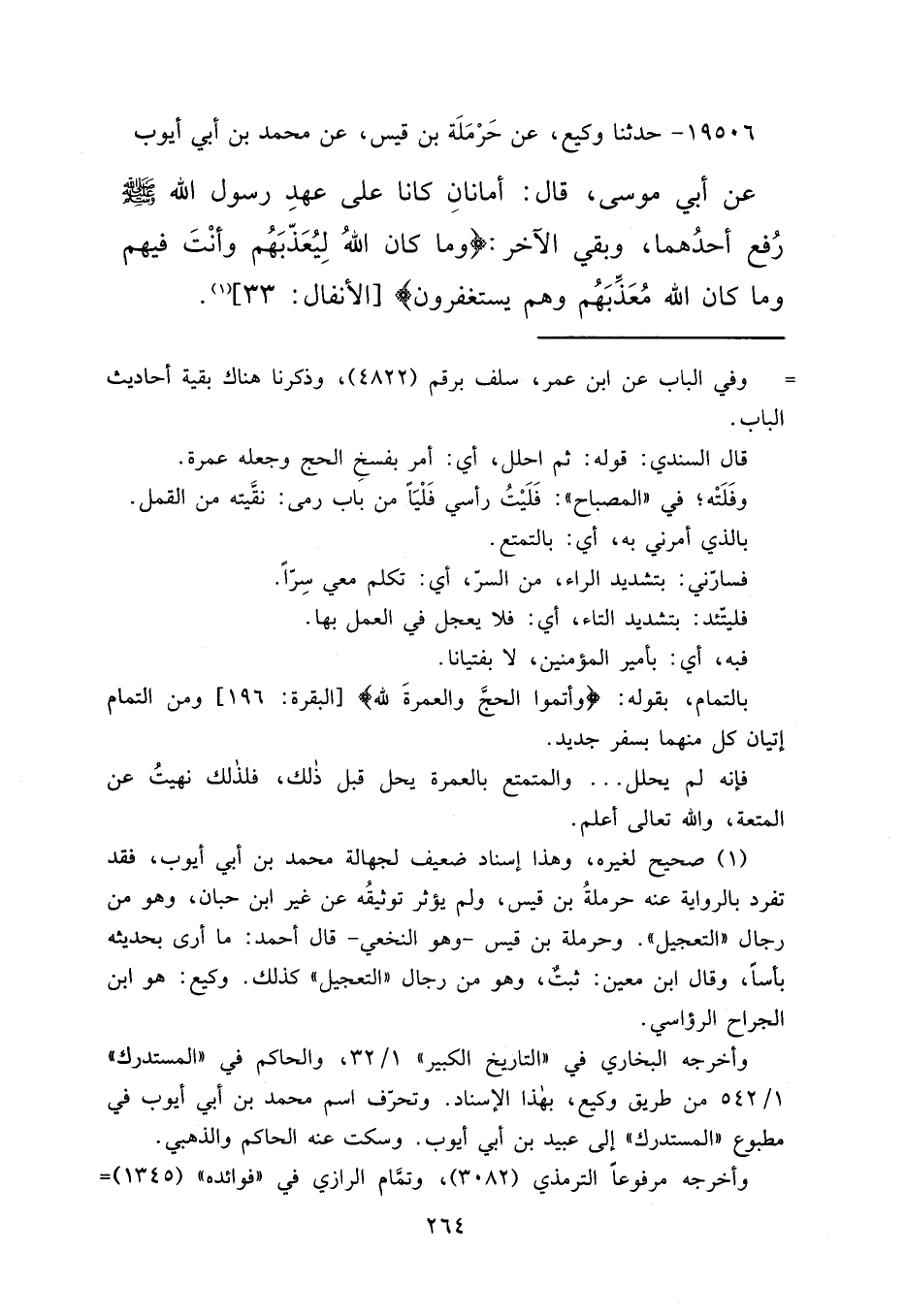 ١٩٥٠٦ - حَدَّثَنَا وَكِيعٌ، عَنْ حَرْمَلَةَ بْنِ قَيْسٍ، عَنْ مُحَمَّدِ بْنِ أَبِي أَيُّوبَ، عَنْ أَبِي مُوسَى قَالَ: " أَمَانَانِ كَانَا عَلَى عَهْدِ رَسُولِ اللهِ صَلَّى اللهُ عَلَيْهِ وَسَلَّمَ، رُفِعَ أَحَدُهُمَا، وَبَقِيَ الْآخَرُ "، {وَمَا كَانَ اللهُ لِيُعَذِّبَهُمْ وَأَنْتَ فِيهِمْ وَمَا كَانَ اللهُ مُعَذِّبَهُمْ وَهُمْ يَسْتَغْفِرُونَ} [الأنفال: ٣٣] (١)