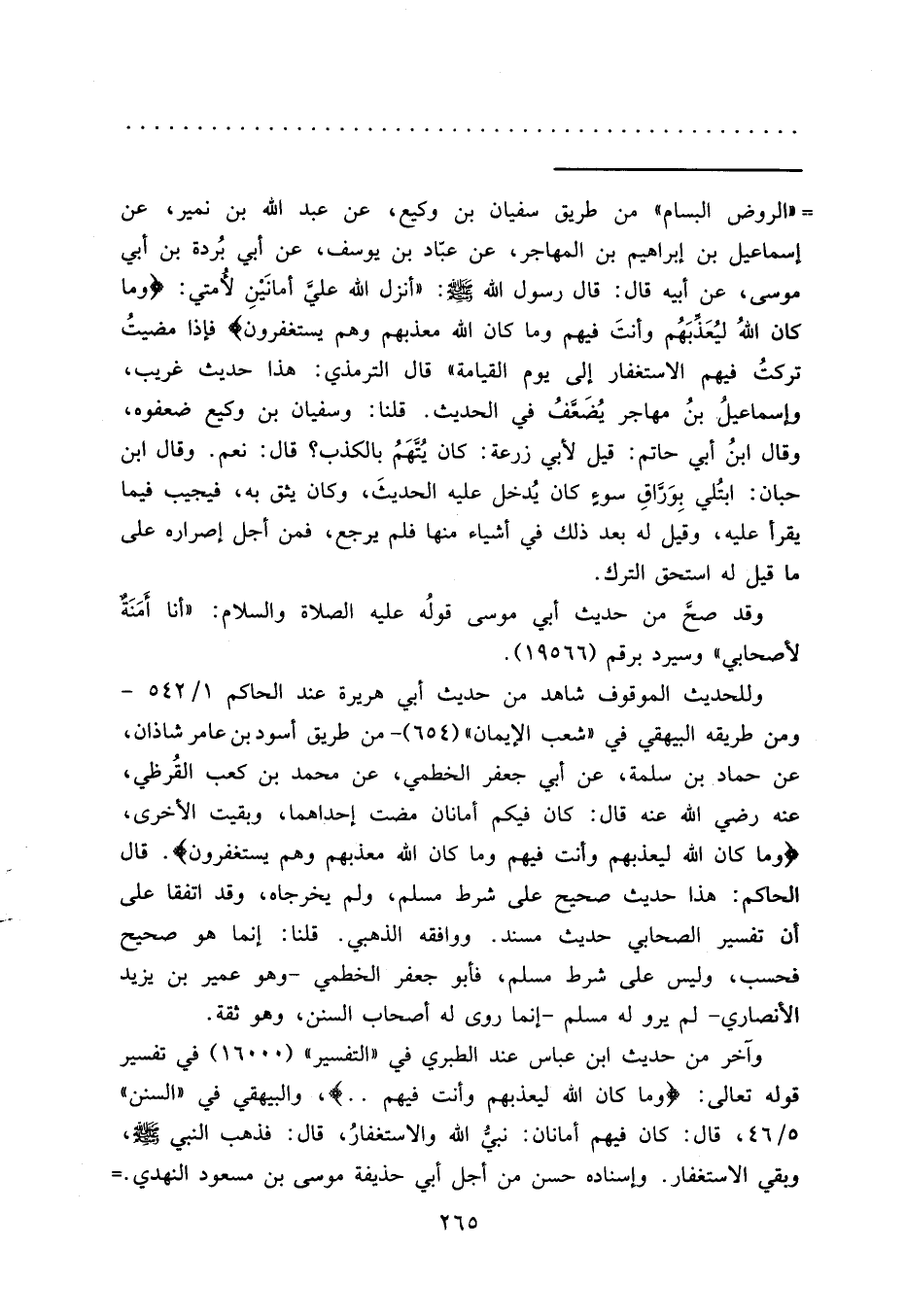= "الروض البسام" من طريق سفيان بن وكيع، عن عبد الله بن نمير، عن إسماعيل بن إبراهيم بن المهاجر، عن عبّاد بن يوسف، عن أبي بُردة بن أبي موسى، عن أبيه قال: قال رسول الله صَلَّى اللهُ عَلَيْهِ وَسَلَّمَ: "أنزل الله علي أمانَيْنِ لأمتي: (وما كان اللهُ ليُعَذبَهُم وأنتَ فيهم وما كان الله معذبهم وهم يستغفرون) فإذا مضيتُ تركتُ فيهم الاستغفار إلى يوم القيامة" قال الترمذي: هذا حديث غريب،