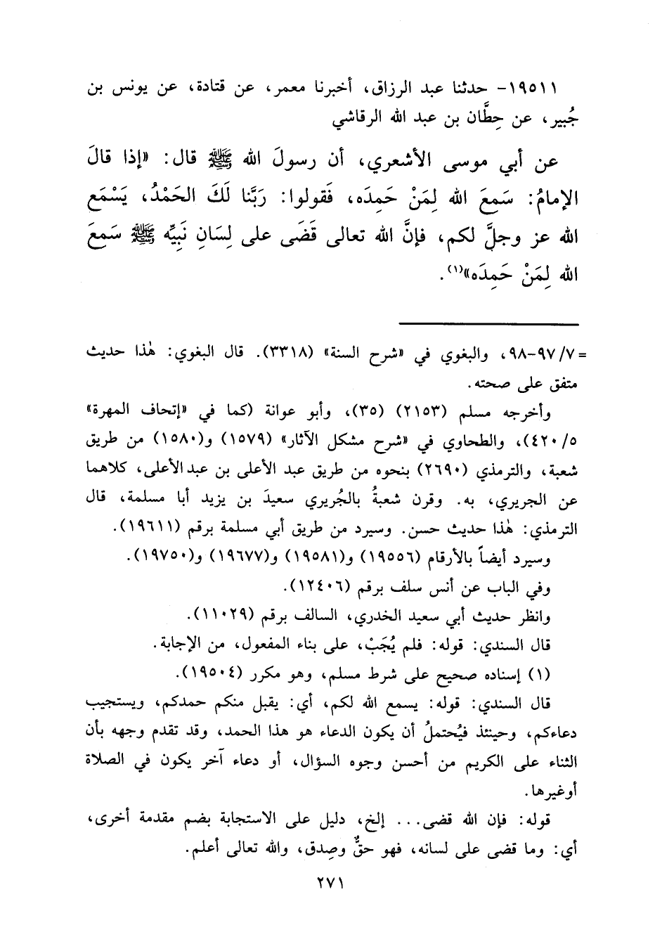 ١٩٥١١ - حَدَّثَنَا عَبْدُ الرَّزَّاقِ، أَخْبَرَنَا مَعْمَرٌ، عَنْ قَتَادَةَ، عَنْ يُونُسَ بْنِ جُبَيْرٍ، عَنْ حِطَّانَ بْنِ عَبْدِ اللهِ الرَّقَاشِيِّ، عَنْ أَبِي مُوسَى الْأَشْعَرِيِّ، أَنَّ رَسُولَ اللهِ صَلَّى اللهُ عَلَيْهِ وَسَلَّمَ قَالَ: " إِذَا قَالَ الْإِمَامُ: سَمِعَ اللهُ لِمَنْ حَمِدَهُ، فَقُولُوا: رَبَّنَا لَكَ الْحَمْدُ، يَسْمَعِ اللهُ عَزَّ وَجَلَّ لَكُمْ، فَإِنَّ اللهَ تَعَالَى، قَضَى عَلَى لِسَانِ نَبِيِّهِ صَلَّى اللهُ عَلَيْهِ وَسَلَّمَ سَمِعَ اللهُ لِمَنْ حَمِدَهُ " (١)