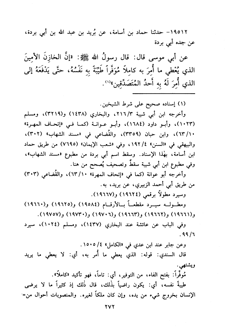 ١٩٥١٢ - حَدَّثَنَا حَمَّادُ بْنُ أُسَامَةَ، عَنْ بُرَيْدِ بْنِ عَبْدِ اللهِ بْنِ أَبِي بُرْدَةَ، عَنْ جَدِّهِ أَبِي بُرْدَةَ، عَنْ أَبِي مُوسَى قَالَ: قَالَ رَسُولُ اللهِ صَلَّى اللهُ عَلَيْهِ وَسَلَّمَ: " إِنَّ الْخَازِنَ الْأَمِينَ الَّذِي يُعْطِي مَا أُمِرَ بِهِ، كَامِلًا مُوَفَّرًا طَيِّبَةً بِهِ نَفْسُهُ، حَتَّى يَدْفَعَهُ إِلَى الَّذِي أُمِرَ لَهُ بِهِ أَحَدُ الْمُتَصَدِّقِينَ " (١)