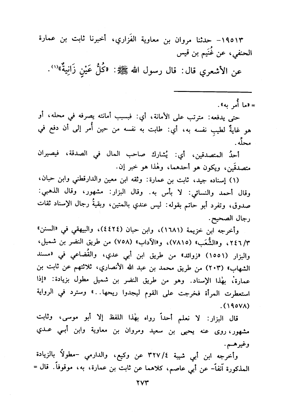 ١٩٥١٣ - حَدَّثَنَا مَرْوَانُ بْنُ مُعَاوِيَةَ الْفَزَارِيُّ، أَخْبَرَنَا ثَابِتُ بْنُ عُمَارَةَ الْحَنَفِيُّ، عَنْ غُنَيْمِ بْنِ قَيْسٍ، عَنِ الْأَشْعَرِيِّ قَالَ: قَالَ رَسُولُ اللهِ صَلَّى اللهُ عَلَيْهِ وَسَلَّمَ: " كُلُّ عَيْنٍ زَانِيَةٌ " (١)