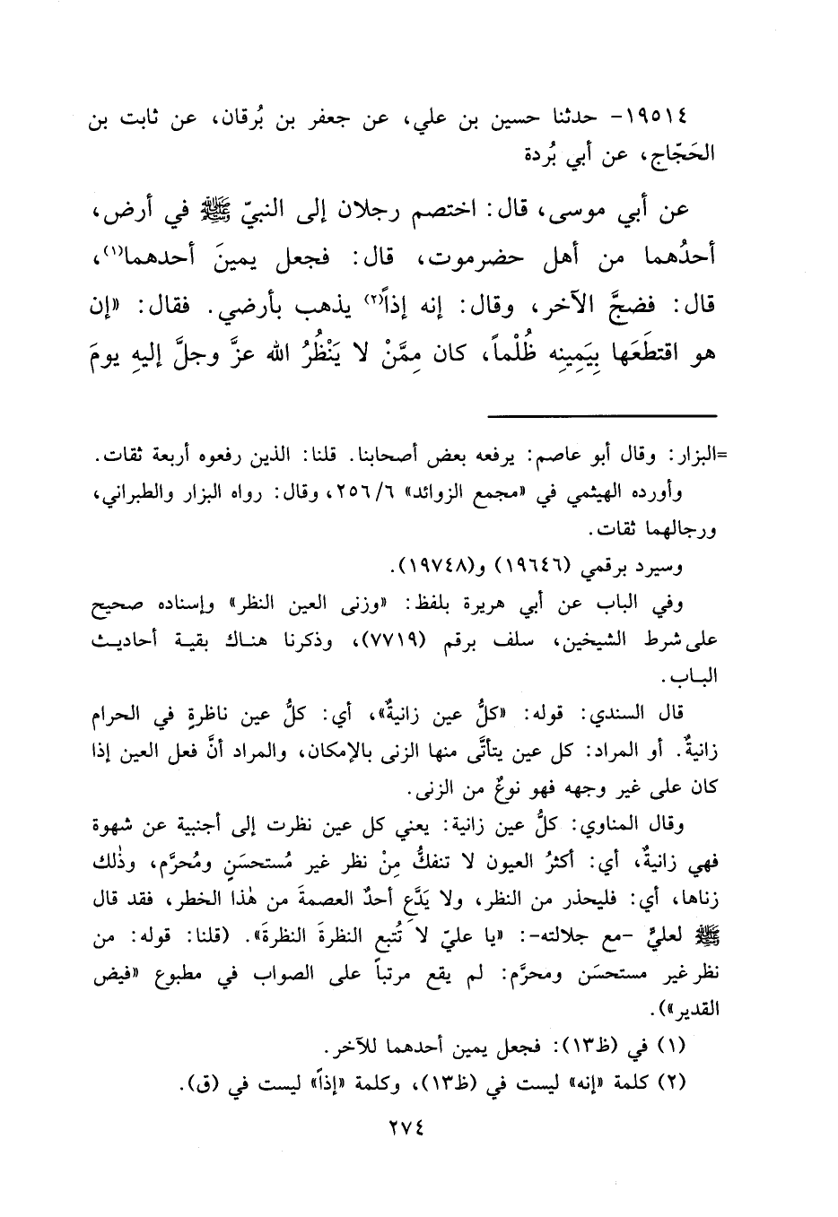١٩٥١٤ - حَدَّثَنَا حُسَيْنُ بْنُ عَلِيٍّ، عَنْ جَعْفَرِ بْنِ بُرْقَانَ، عَنْ ثَابِتِ بْنِ الْحَجَّاجِ، عَنْ أَبِي بُرْدَةَ، عَنْ أَبِي مُوسَى قَالَ: اخْتَصَمَ رَجُلَانِ إِلَى النَّبِيِّ صَلَّى اللهُ عَلَيْهِ وَسَلَّمَ فِي أَرْضٍ أَحَدُهُمَا مِنْ أَهْلِ حَضْرَمَوْتَ، قَالَ: فَجَعَلَ يَمِينَ أَحَدِهِمَا (١) ، قَالَ: فَضَجَّ الْآخَرُ، وَقَالَ: إِنَّهُ إِذًا (٢) يَذْهَبُ بِأَرْضِي. فَقَالَ: " إِنْ هُوَ اقْتَطَعَهَا بِيَمِينِهِ ظُلْمًا، كَانَ مِمَّنْ لَا يَنْظُرُ اللهُ عَزَّ وَجَلَّ إِلَيْهِ يَوْمَ