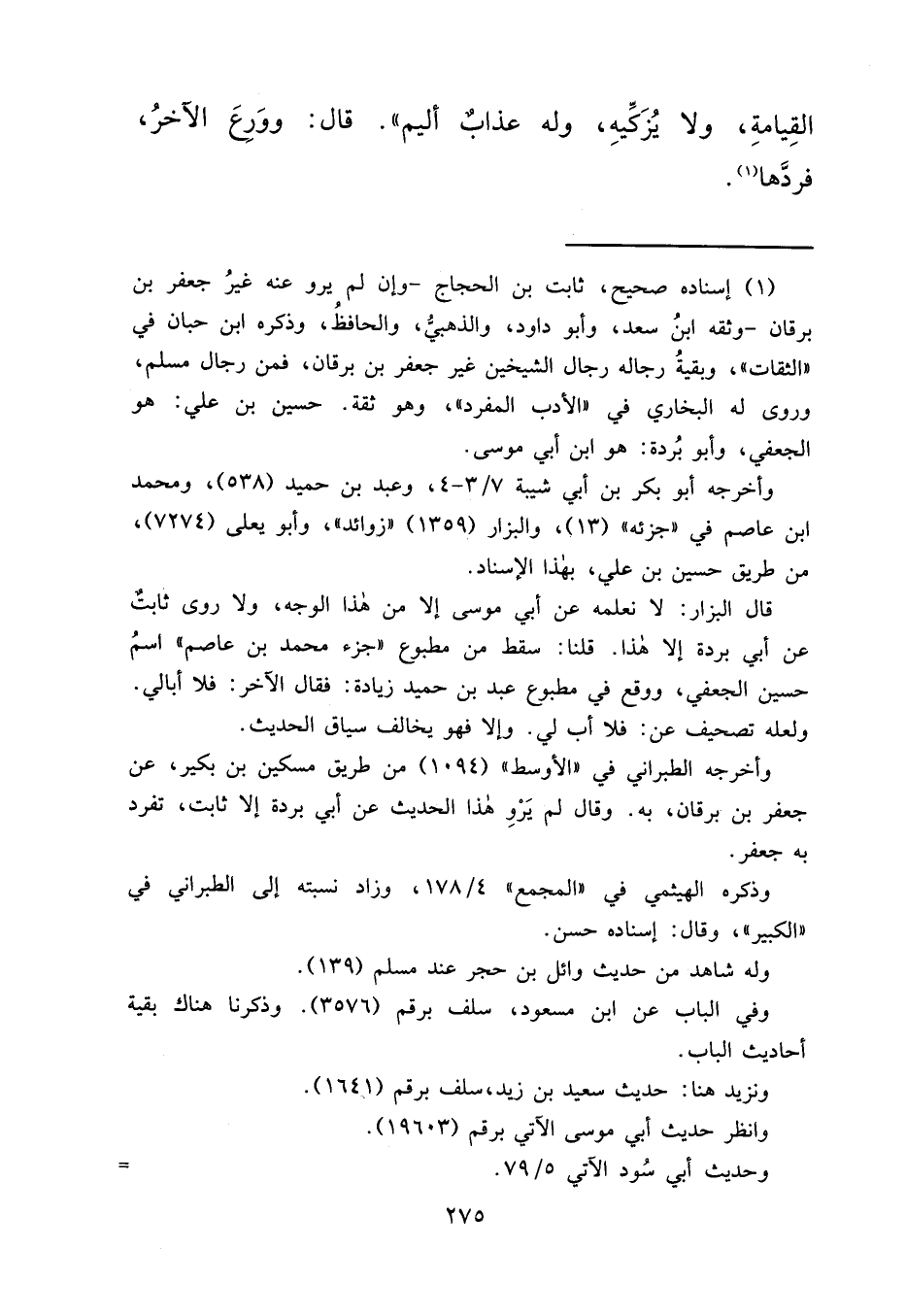 قال البزار: لا نعلمه عن أبي موسى إلا من هذا الوجه، ولا روى ثابتٌ عن أبي بردة إلا هذا. قلنا: سقط من مطبوع "جزء محمد بن عاصم" اسمُ حسين الجعفي، ووقع في مطبوع عبد بن حميد زيادة: فقال الآخر: فلا أبالي.
