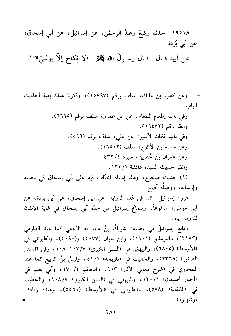 ١٩٥١٨ - حَدَّثَنَا وَكِيعٌ، وَعَبْدُ الرَّحْمَنِ، عَنْ إِسْرَائِيلَ، عَنْ أَبِي إِسْحَاقَ، عَنْ أَبِي بُرْدَةَ، عَنْ أَبِيهِ قَالَ: قَالَ رَسُولُ اللهِ صَلَّى اللهُ عَلَيْهِ وَسَلَّمَ: " لَا نِكَاحَ إِلَّا بِوَلِيٍّ " (١)