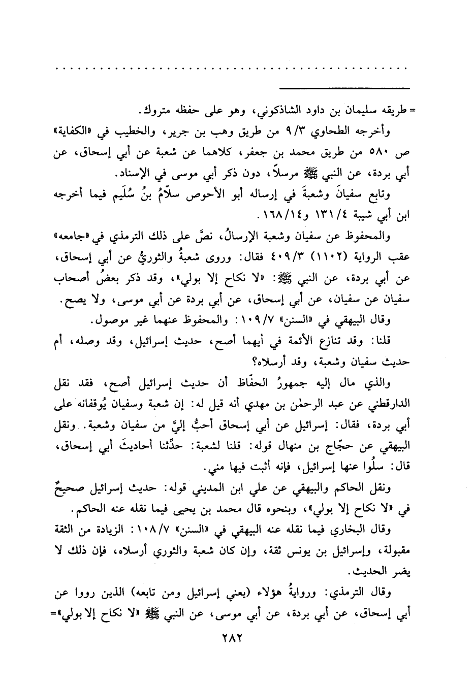 وقال الترمذي: وروايةُ هؤلاء (يعني إسرائيل ومن تابعه) الذين رووا عن أبي إسحاق، عن أبي بردة، عن أبي موسى، عن النبي صَلَّى اللهُ عَلَيْهِ وَسَلَّمَ "لا نكاح إلا بولي"=