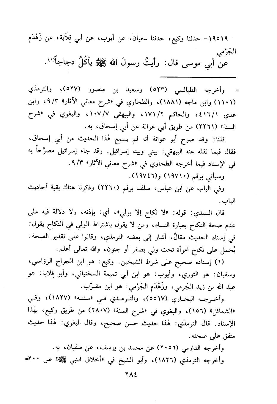 ١٩٥١٩ - حَدَّثَنَا وَكِيعٌ، حَدَّثَنَا سُفْيَانُ، عَنْ أَيُّوبَ، عَنْ أَبِي قِلَابَةَ، عَنْ زَهْدَمٍ الْجَرْمِيِّ، عَنْ أَبِي مُوسَى قَالَ: رَأَيْتُ رَسُولَ اللهِ صَلَّى اللهُ عَلَيْهِ وَسَلَّمَ " يَأْكُلُ دَجَاجًا " (١)