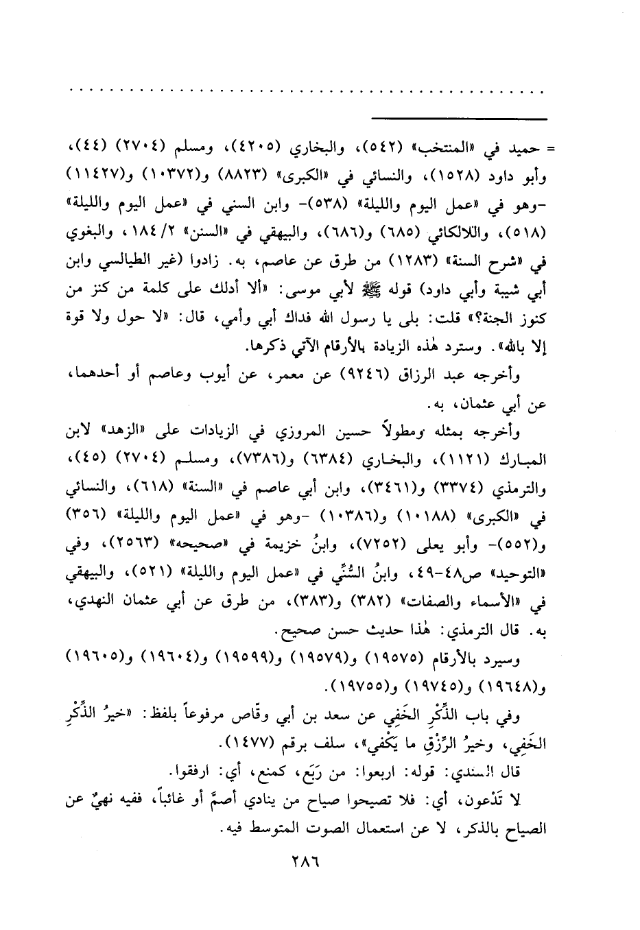 = حميد في "المنتخب" (٥٤٢) ، والبخاري (٤٢٠٥) ، ومسلم (٢٧٠٤) (٤٤) ، وأبو داود (١٥٢٨) ، والنسائي في "الكبرى" (٨٨٢٣) و (١٠٣٧٢) و (١١٤٢٧) - وهو في "عمل اليوم والليلة" (٥٣٨) - وابن السني في "عمل اليوم والليلة" (٥١٨) ، واللالكائي (٦٨٥) و (٦٨٦) ، والبيهقي في "السنن" ٢/١٨٤، والبغوي في "شرح السنة" (١٢٨٣) من طرق عن عاصم، به. زادوا (غير الطيالسي وابن أبي شيبة وأبي داود) قوله صَلَّى اللهُ عَلَيْهِ وَسَلَّمَ لأبي موسى: "ألا أدلك على كلمة من كنز من كنوز الجنة؟ " قلت: بلى يا رسول الله فداك أبي وأمي، قال: "لا حول ولا قوة