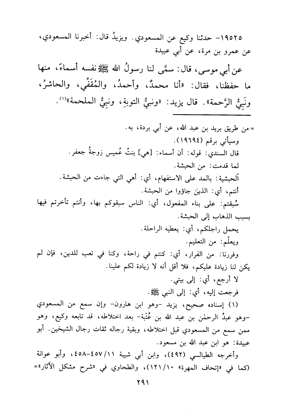 ١٩٥٢٥ - حَدَّثَنَا وَكِيعٌ، عَنْ الْمَسْعُودِيِّ، وَيَزِيدُ قَالَ: أَخْبَرَنَا الْمَسْعُودِيُّ، عَنْ عَمْرِو بْنِ مُرَّةَ، عَنْ أَبِي عُبَيْدَةَ، عَنْ أَبِي مُوسَى قَالَ: سَمَّى لَنَا رَسُولُ اللهِ صَلَّى اللهُ عَلَيْهِ وَسَلَّمَ نَفْسَهُ أَسْمَاءً مِنْهَا مَا حَفِظْنَا فَقَالَ: " أَنَا مُحَمَّدٌ، وأَحْمَدُ، والْمُقَفِّي، والْحَاشِرُ، ونَبِيُّ الرَّحْمَةِ، قَالَ يَزِيدُ، ونَبِيُّ التَّوْبَةِ ونَبِيُّ الْمَلْحَمَةِ " (١)
