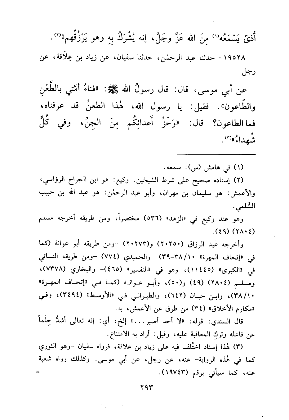 ١٩٥٢٨ - حَدَّثَنَا عَبْدُ الرَّحْمَنِ، حَدَّثَنَا سُفْيَانُ، عَنْ زِيَادِ بْنِ عِلَاقَةَ، عَنْ رَجُلٍ، عَنْ أَبِي مُوسَى قَالَ: قَالَ رَسُولُ اللهِ صَلَّى اللهُ عَلَيْهِ وَسَلَّمَ: " فَنَاءُ أُمَّتِي بِالطَّعْنِ وَالطَّاعُونِ ". فَقِيلَ: يَا رَسُولَ اللهِ، هَذَا الطَّعْنُ قَدْ عَرَفْنَاهُ، فَمَا الطَّاعُونُ؟ قَالَ: " وَخْزُ أَعْدَائِكُمْ مِنَ الْجِنِّ وَفِي كُلٍّ شُهَدَاءُ " (٣)
