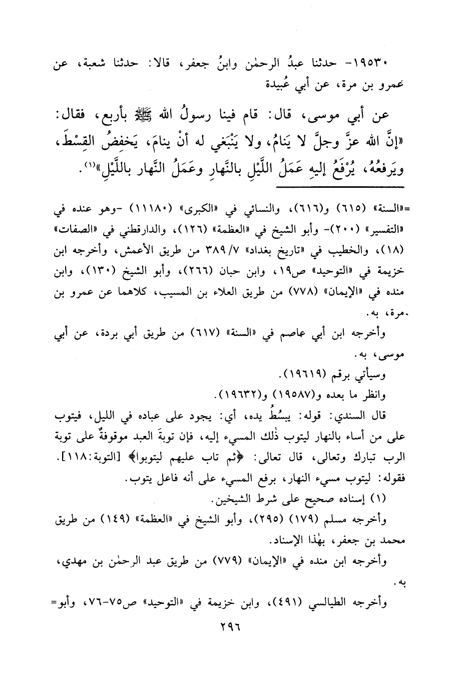 ١٩٥٣٠ - حَدَّثَنَا عَبْدُ الرَّحْمَنِ، وَابْنُ جَعْفَرٍ قَالَا: حَدَّثَنَا شُعْبَةُ، عَنْ عَمْرِو بْنِ مُرَّةَ، عَنْ أَبِي عُبَيْدَةَ، عَنْ أَبِي مُوسَى قَالَ: قَامَ فِينَا رَسُولُ اللهِ صَلَّى اللهُ عَلَيْهِ وَسَلَّمَ بِأَرْبَعٍ فَقَالَ: " إِنَّ اللهَ عَزَّ وَجَلَّ لَا يَنَامُ وَلَا يَنْبَغِي لَهُ أَنْ يَنَامَ. يَخْفِضُ الْقِسْطَ وَيَرْفَعُهُ. يُرْفَعُ إِلَيْهِ عَمَلُ اللَّيْلِ بِالنَّهَارِ وَعَمَلُ النَّهَارِ بِاللَّيْلِ " (١)