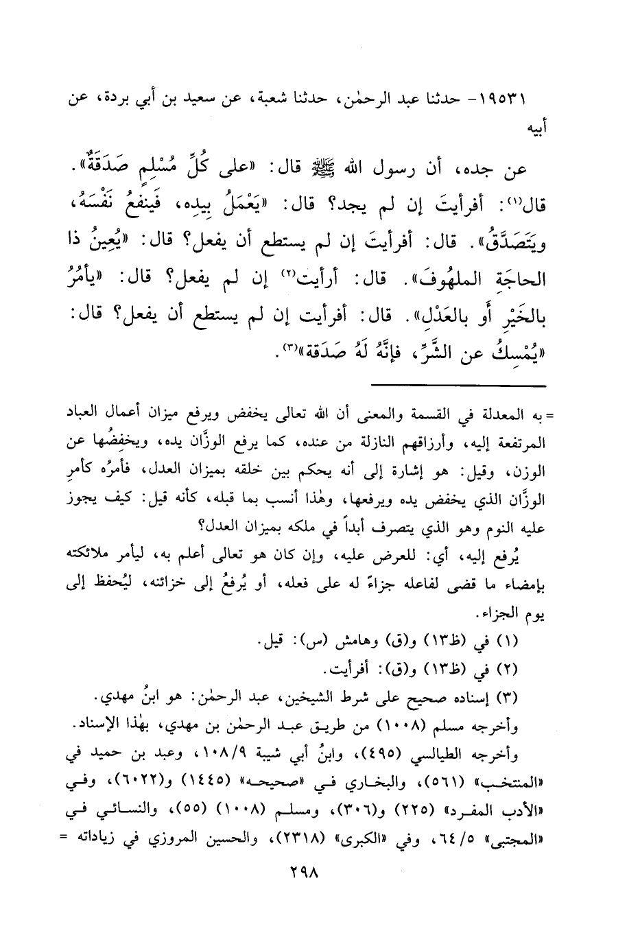 ١٩٥٣١ - حَدَّثَنَا عَبْدُ الرَّحْمَنِ، حَدَّثَنَا شُعْبَةُ، عَنْ سَعِيدِ بْنِ أَبِي بُرْدَةَ، عَنْ أَبِيهِ، عَنْ جَدِّهِ، أَنَّ رَسُولَ اللهِ صَلَّى اللهُ عَلَيْهِ وَسَلَّمَ قَالَ: " عَلَى كُلِّ مُسْلِمٍ صَدَقَةٌ ". قَالَ (١) : أَفَرَأَيْتَ إِنْ لَمْ يَجِدْ؟ قَالَ: " يَعْمَلُ بِيَدِهِ فَيَنْفَعُ نَفْسَهُ وَيَتَصَدَّقُ ". قَالَ: أَفَرَأَيْتَ إِنْ لَمْ يَسْتَطِعْ أَنْ يَفْعَلَ؟ قَالَ: " يُعِينُ ذَا الْحَاجَةِ الْمَلْهُوفَ ". قَالَ: أَرَأَيْتَ (٢) إِنْ لَمْ يَفْعَلْ؟ قَالَ: " يَأْمُرُ بِالْخَيْرِ أَوْ بِالْعَدْلِ ". قَالَ: أَفَرَأَيْتَ إِنْ لَمْ يَسْتَطِعْ أَنْ يَفْعَلَ؟ قَالَ: " يُمْسِكُ عَنِ الشَّرِّ؛ فَإِنَّهُ لَهُ صَدَقَةٌ " (٣)